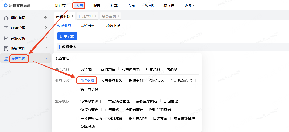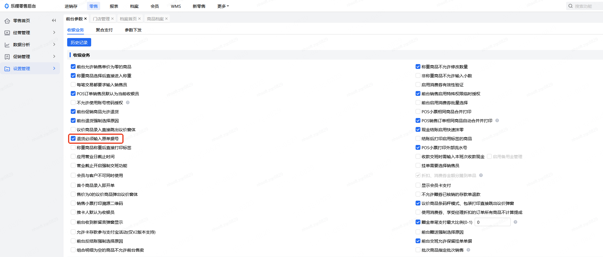 👉【操作路径】:零售-设置管理-前台参数-退货必须输入原单据号