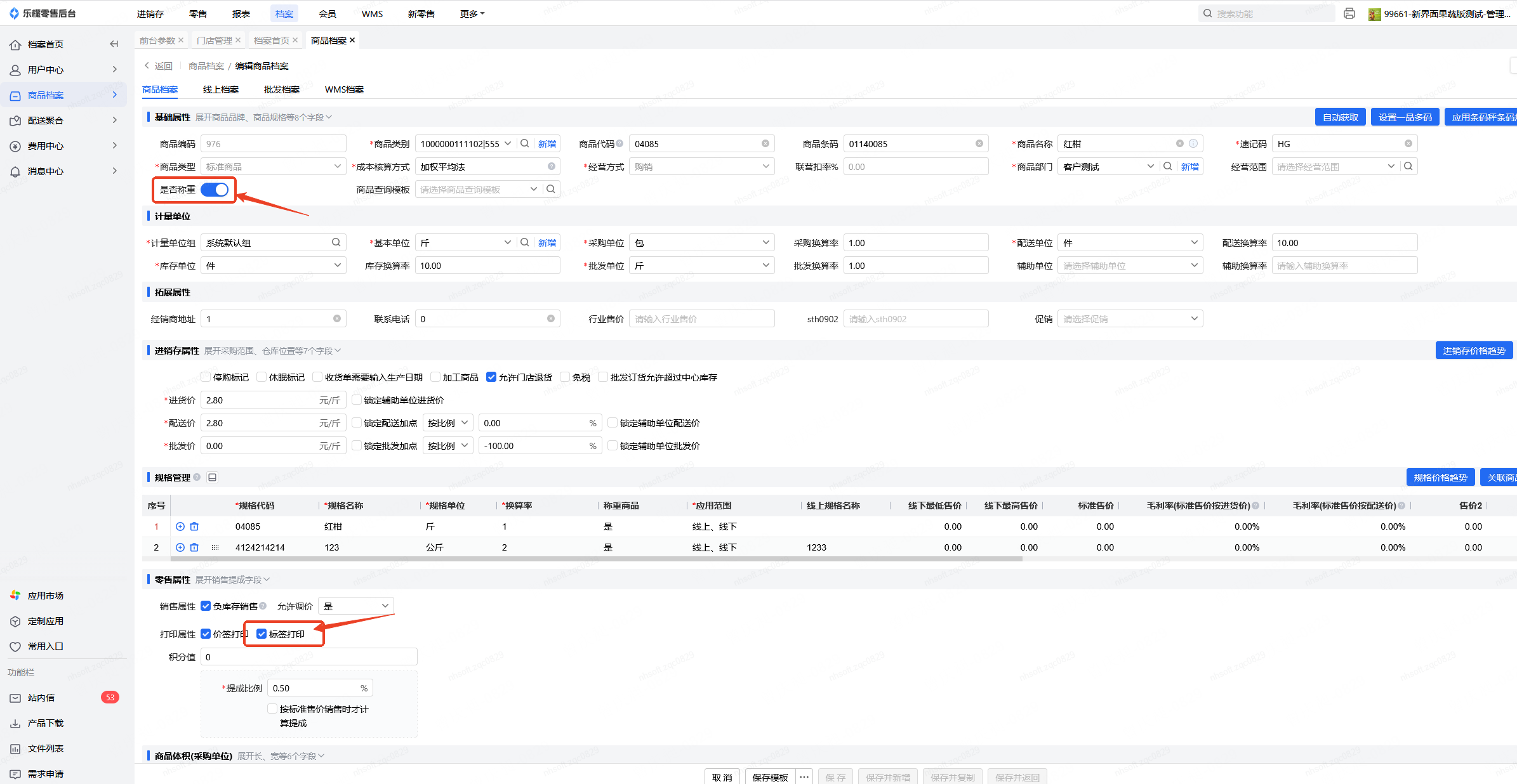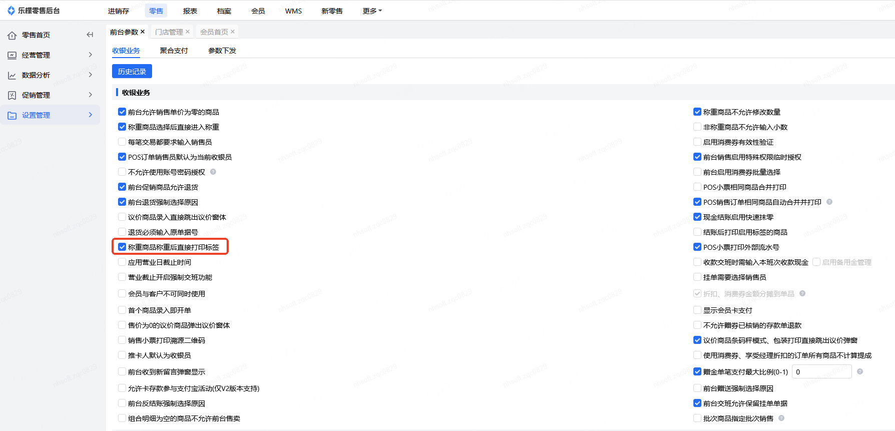 👉【操作路径】:零售-设置管理-前台参数-称重商品称重后直接打印标签