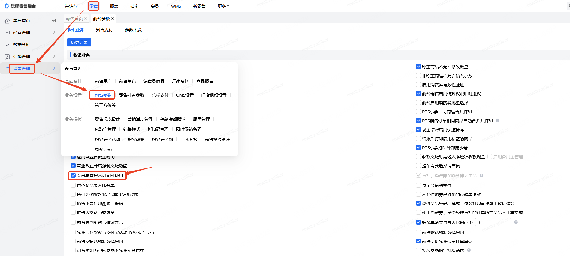 👉【操作路径】:零售-设置管理-前台参数-会员与客户不可同时使用