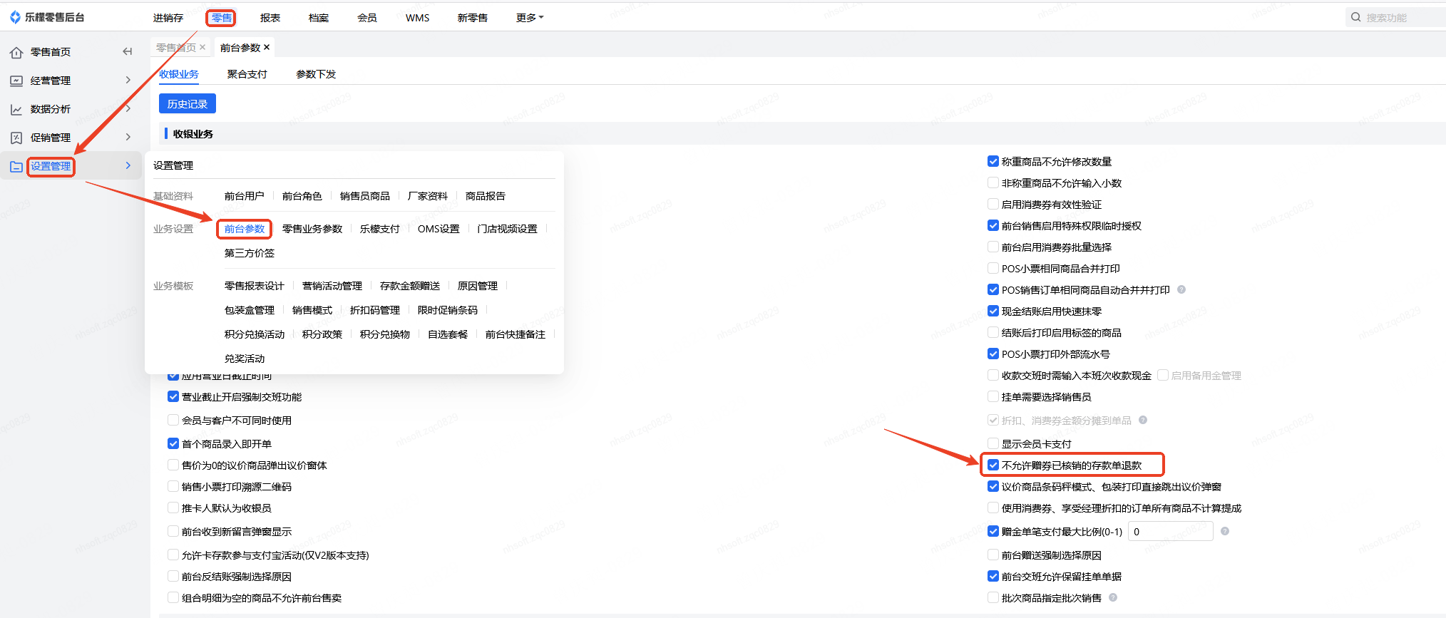 👉【操作路径】:零售-设置管理-前台参数-不允许赠券已核销的存款单退款