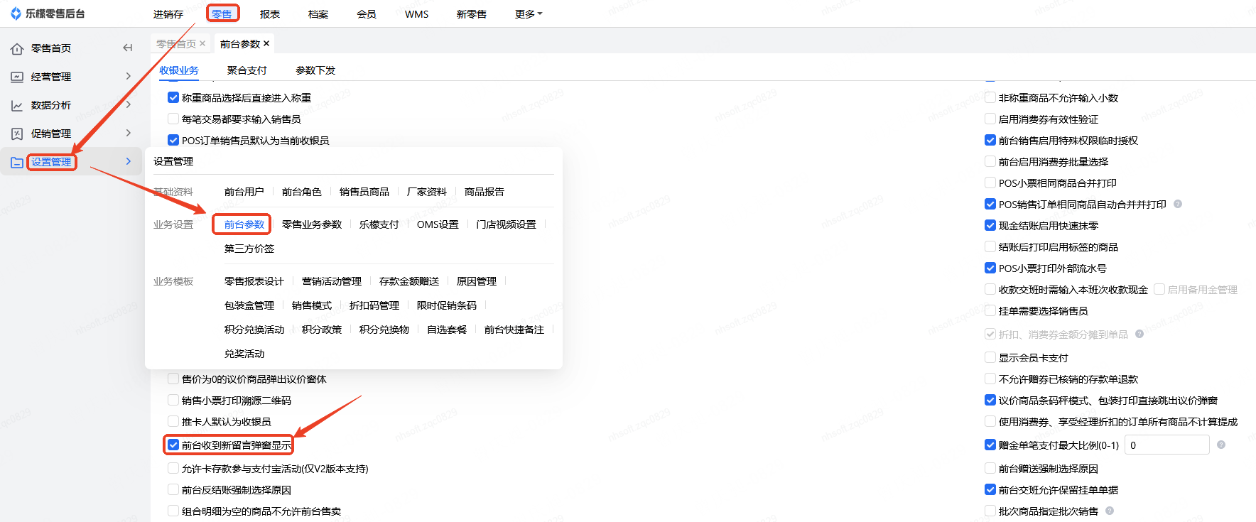 👉【操作路径】:零售-设置管理-前台参数-前台收到新留言弹窗显示