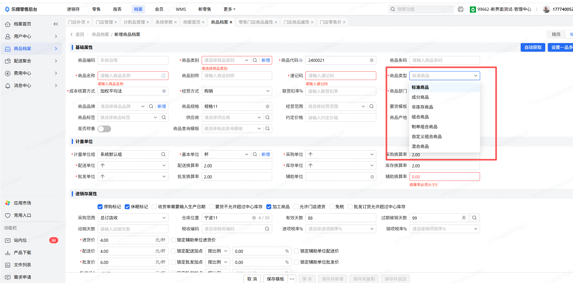 每一个商品都有且仅有一个商品类型,其中商品类型分为标准、组合商品、非库存商品、制单组合商品、自定义组合、成分商品、分级商品、原料商品。