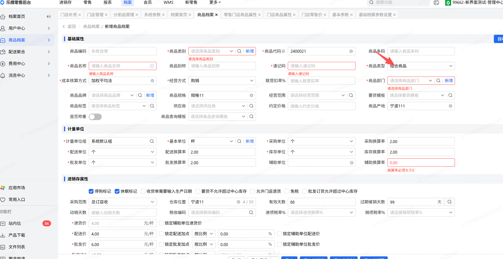 整箱饮料:可以按单位箱或瓶来销售,固定配比一般为1:24,即1箱饮料中有24瓶,则可以创建组合商品来卖整箱饮料,以标准商品单位(瓶)来管理饮料库存