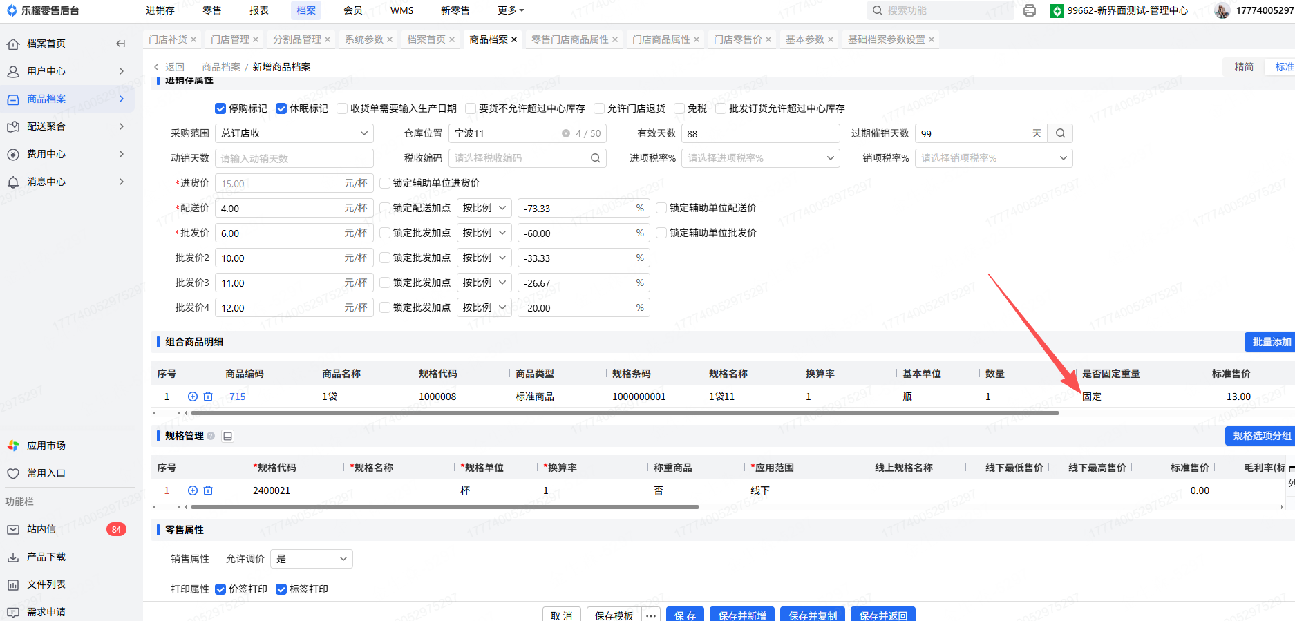 3)、不固定重量:勾选不固定重量时,即不固定重量选择为是时,明细商品需称重