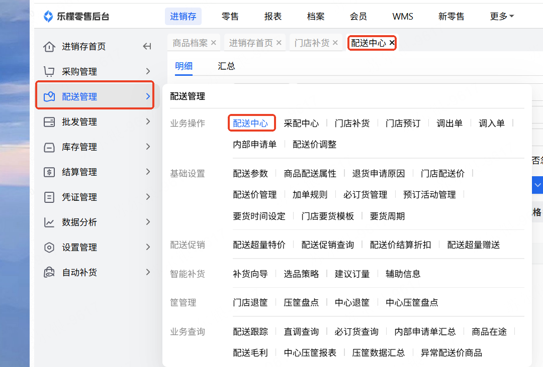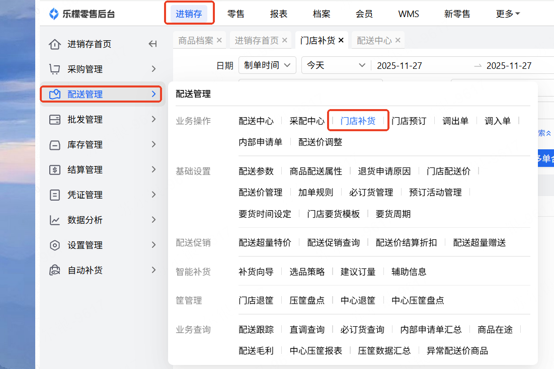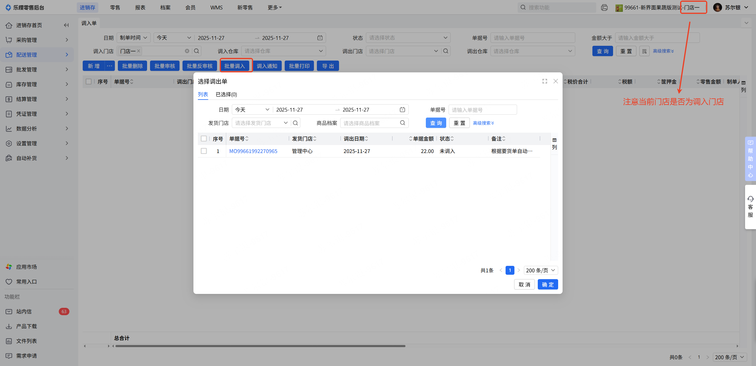门店调入;操作路径:进销存-配送管理-调入单,点击批量调入,选择对应单据进行审核,审核完成门店库存增加。(注意:当前门店门店=门店,而不是管理中心等配送门店)