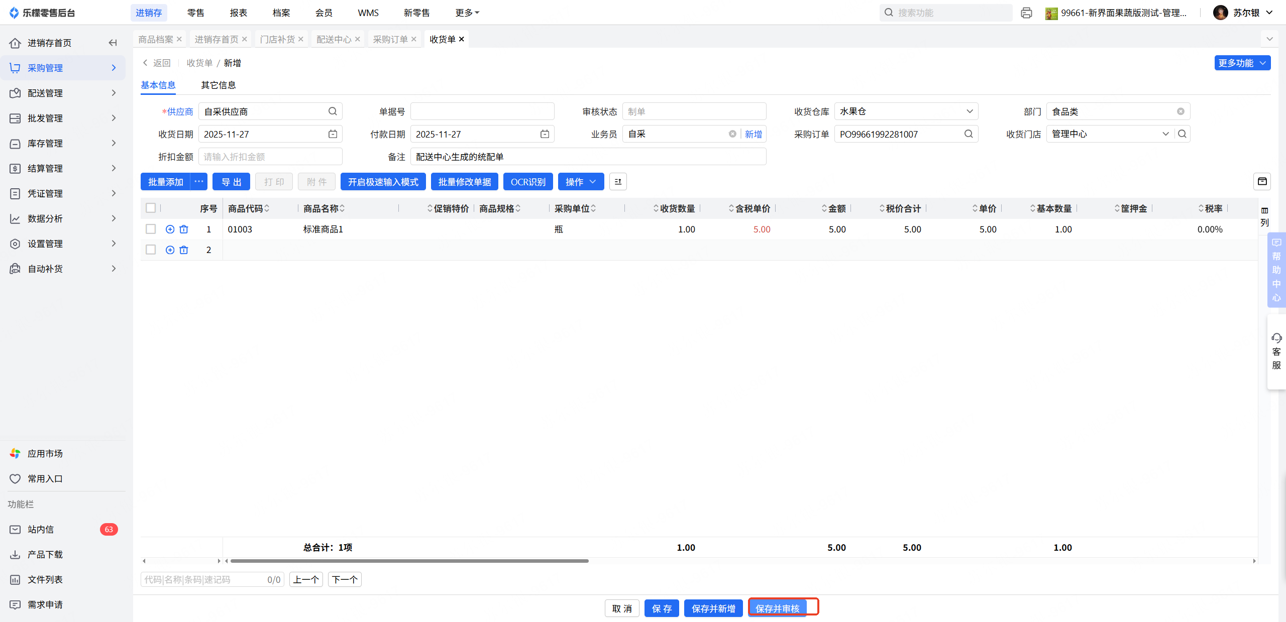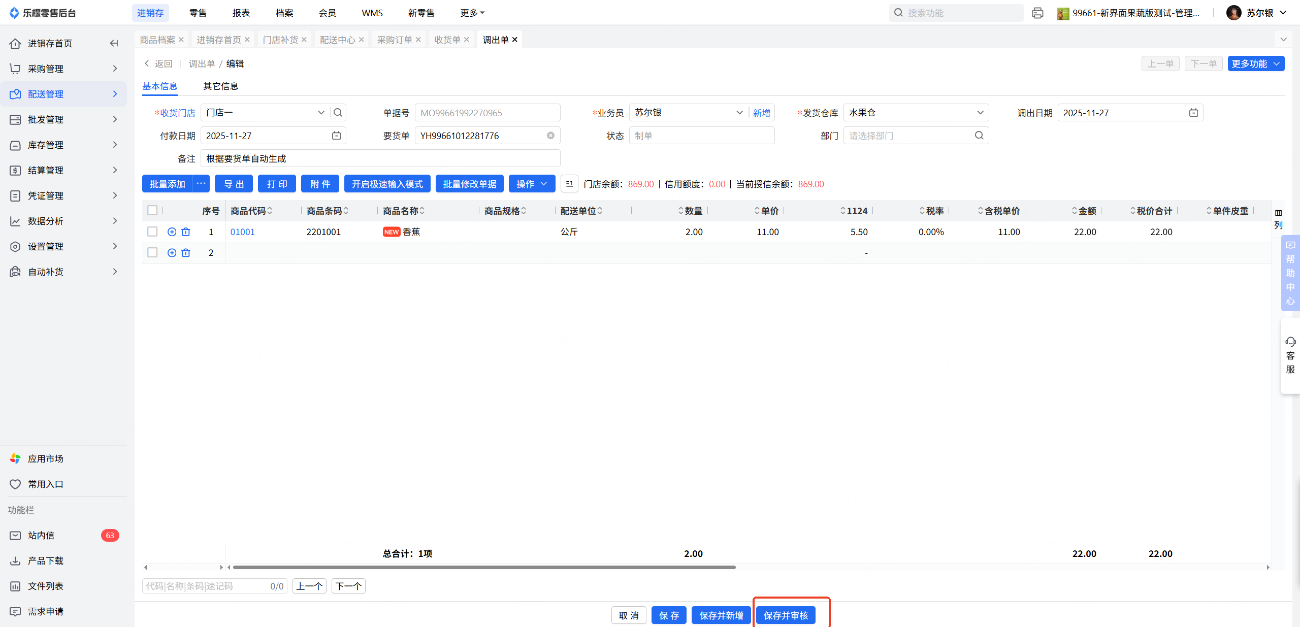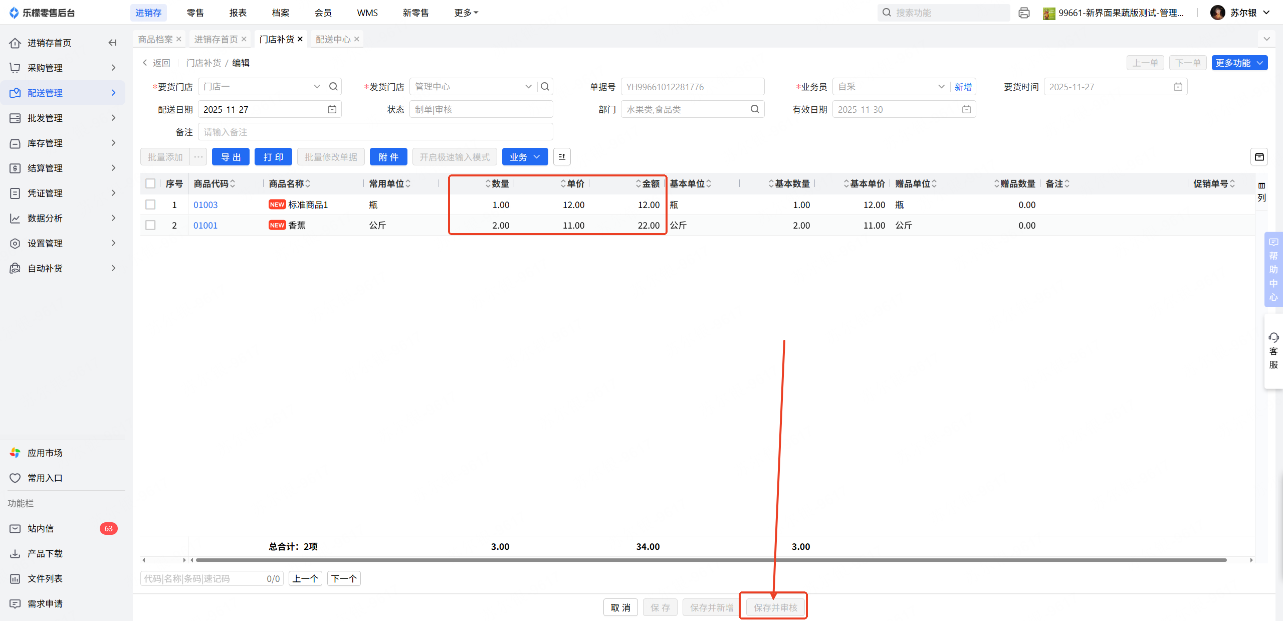 新增单据,录入商品和数量;录入核对完成后,点击保存并审核。