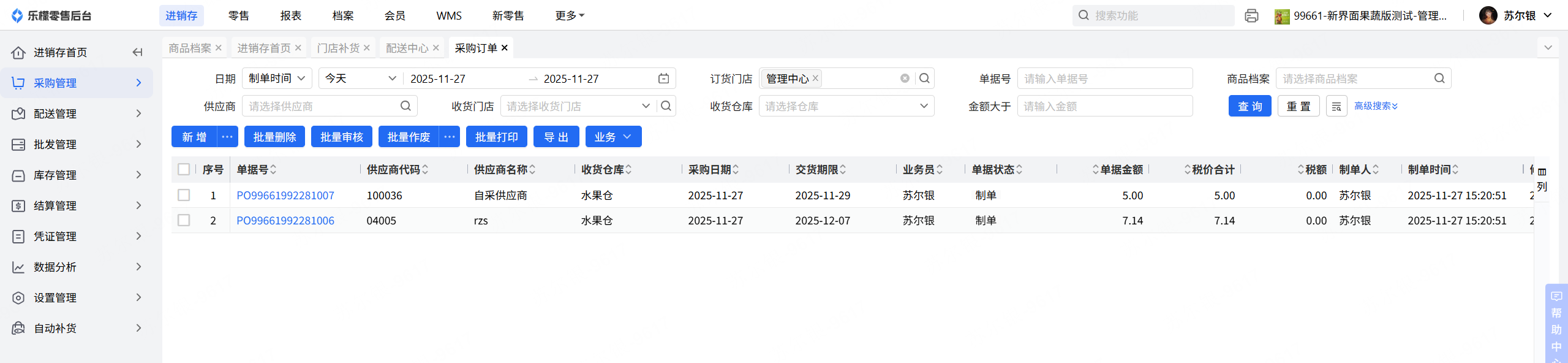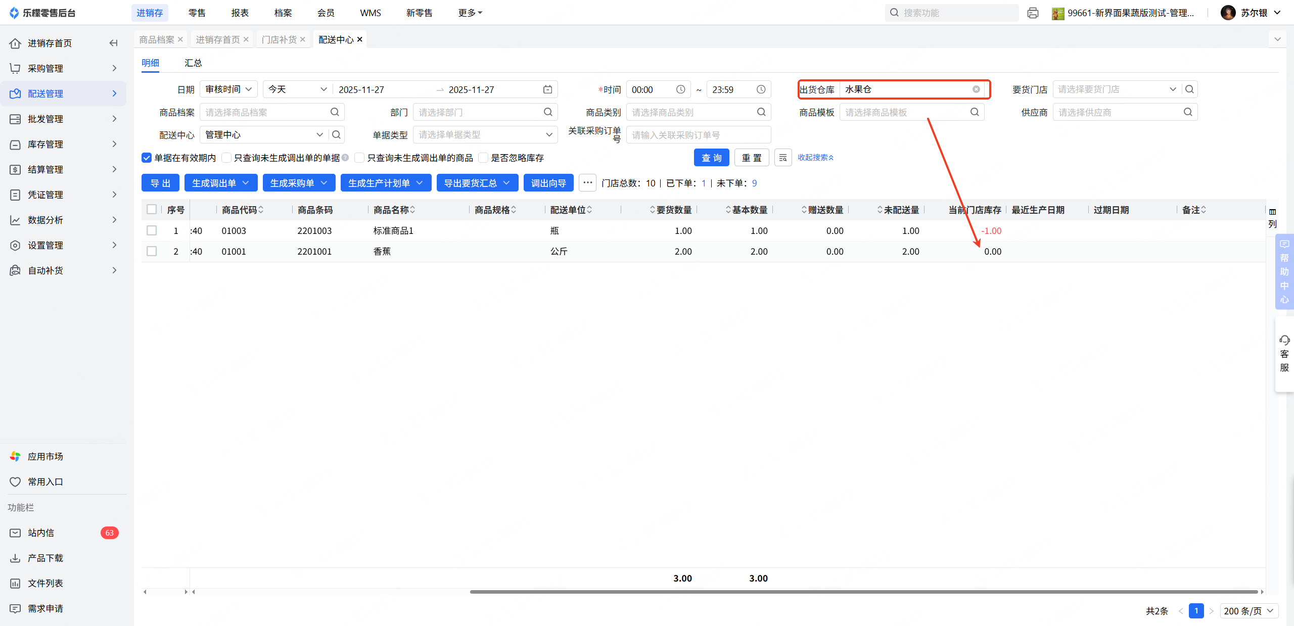 此时总部可以到配送中心查询到门店要货的商品与数量;进销存-配送管理-配送中心