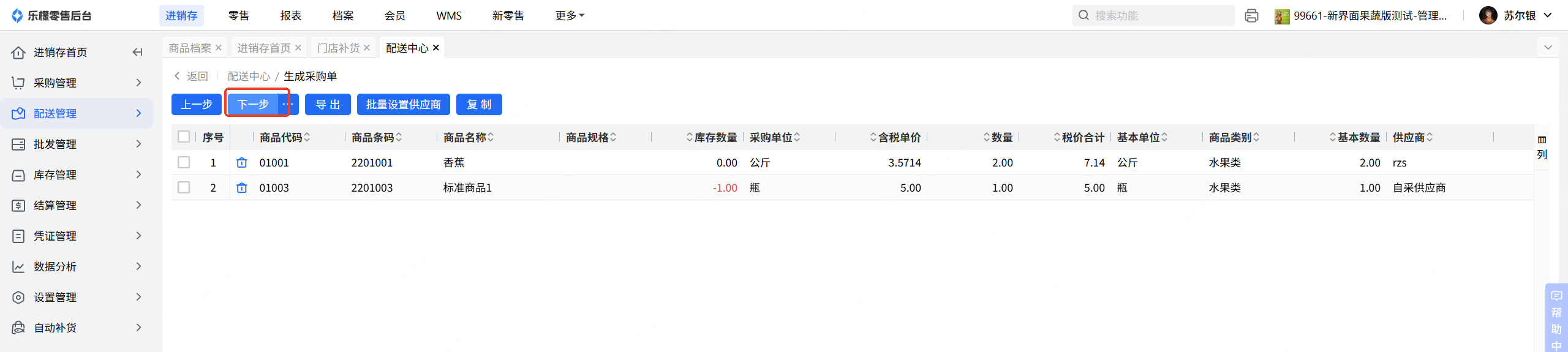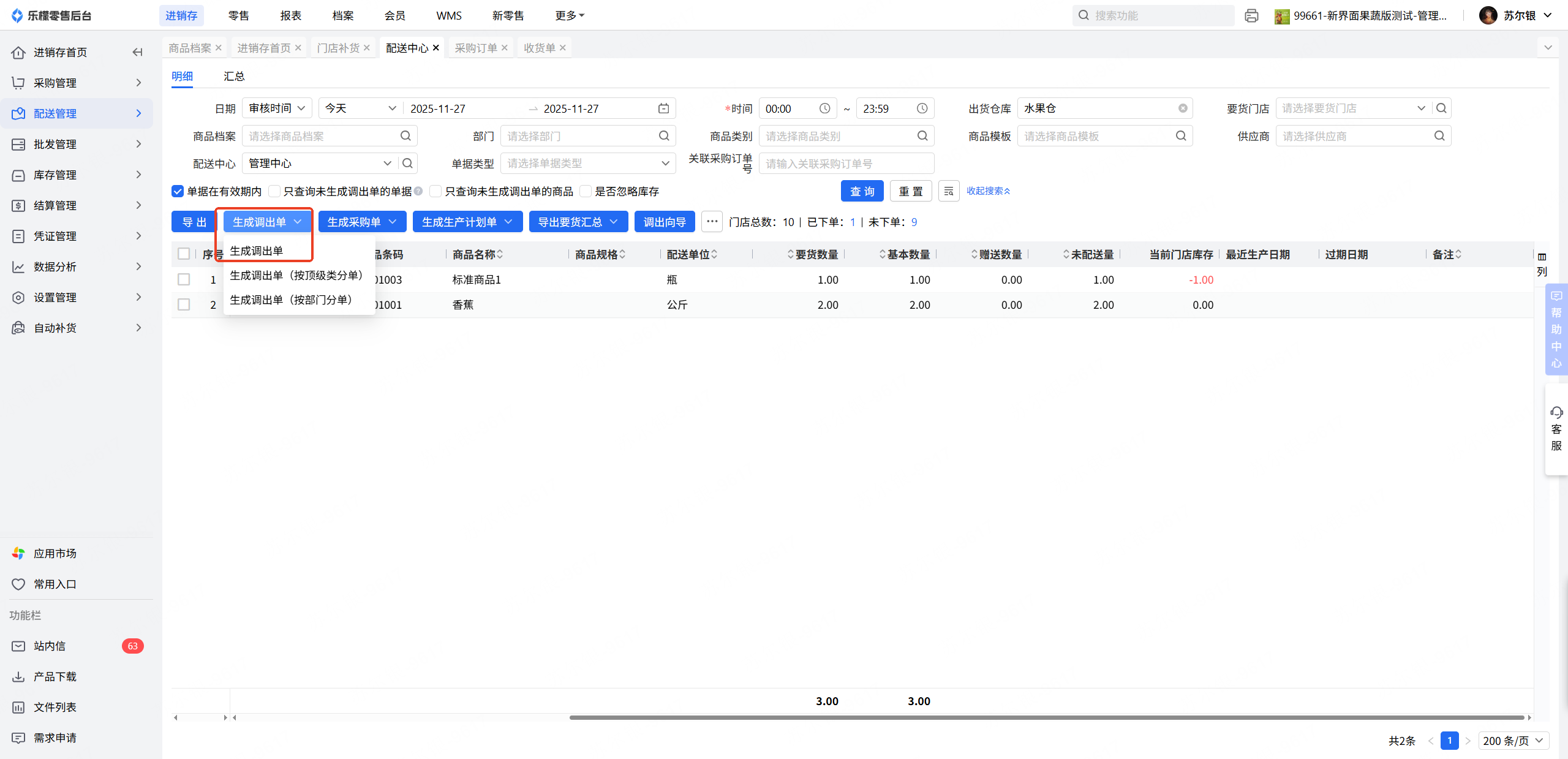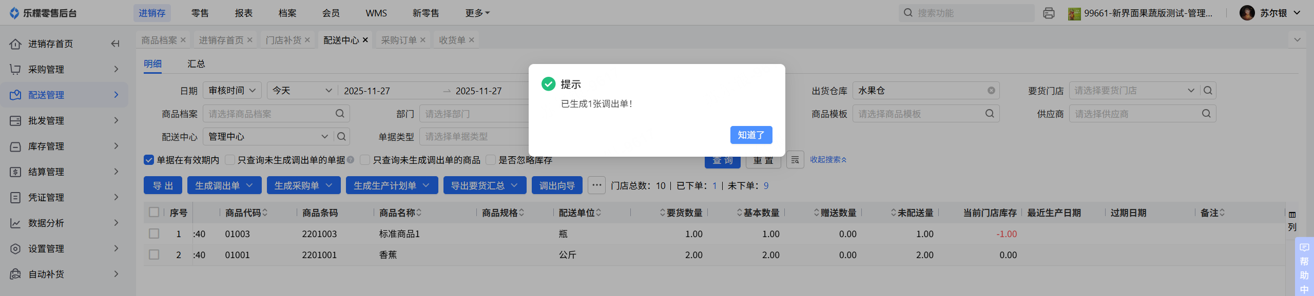 此时回到配送中心,进行调货给门店操作,即生成调出单-生成调出单