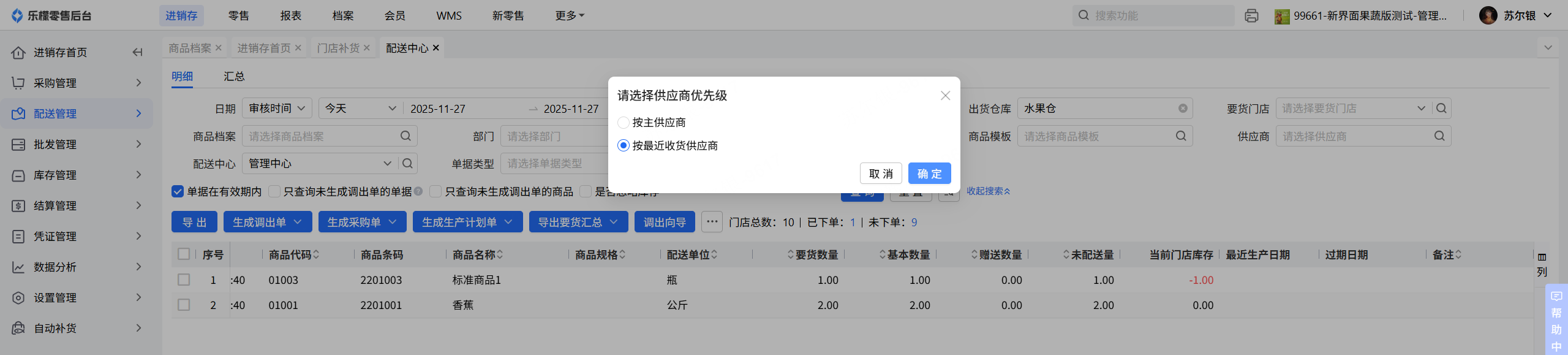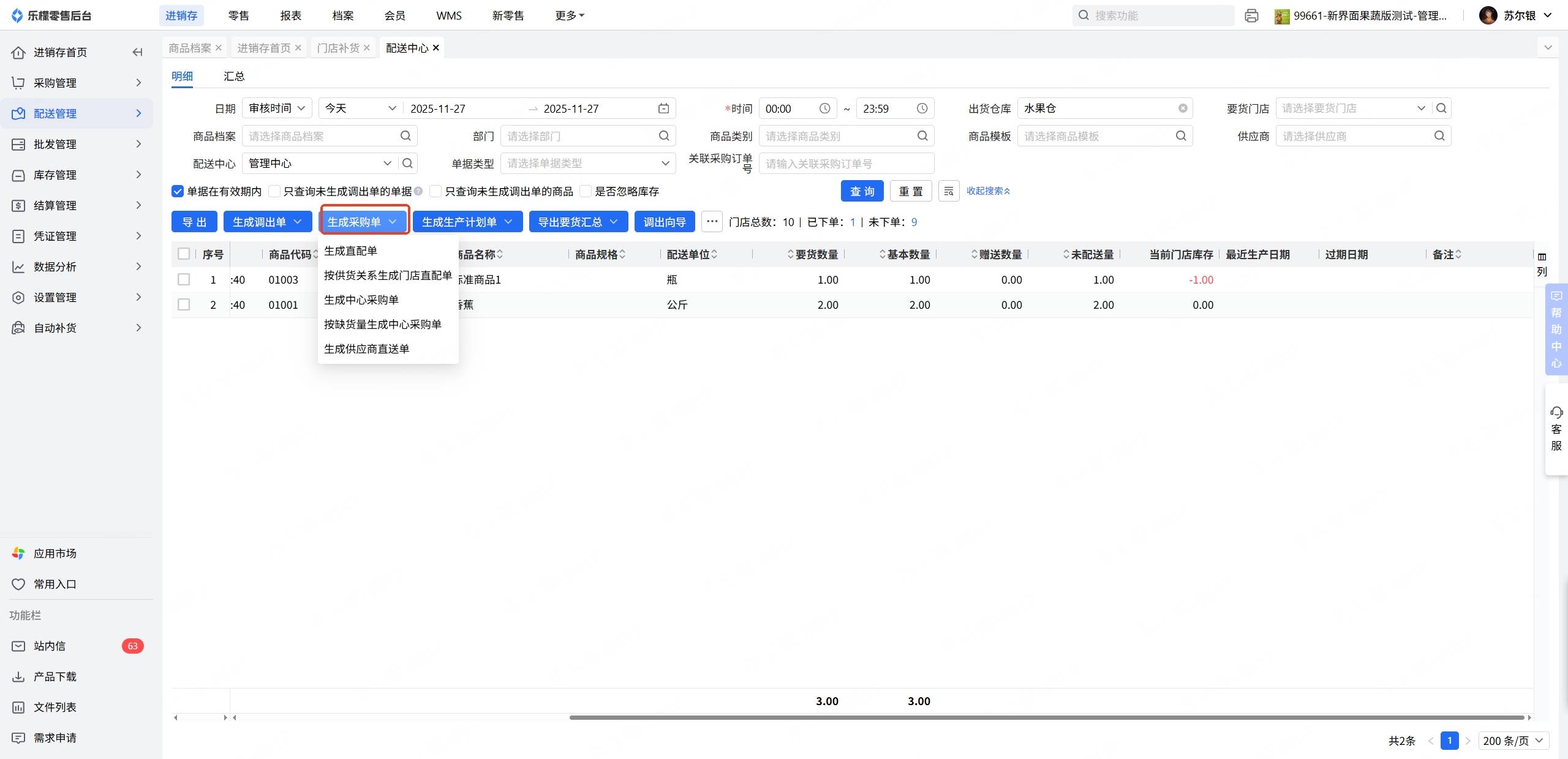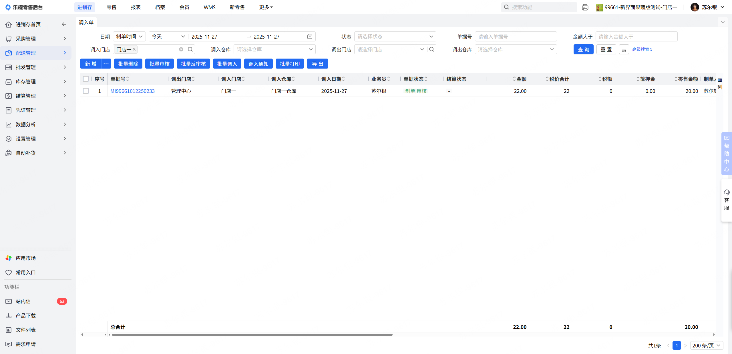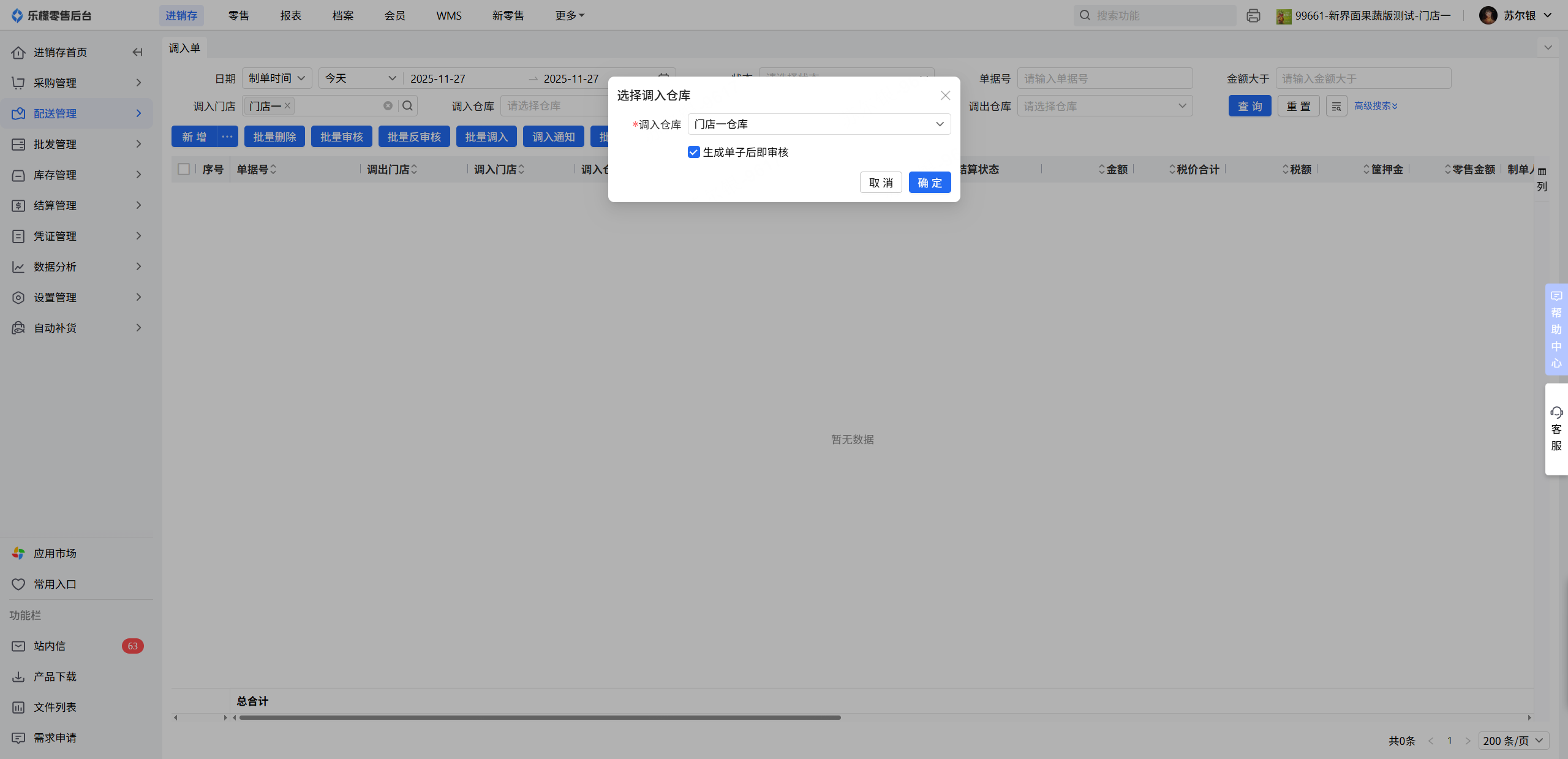 此时回到配送中心,进行调货给门店操作,即生成调出单-生成调出单