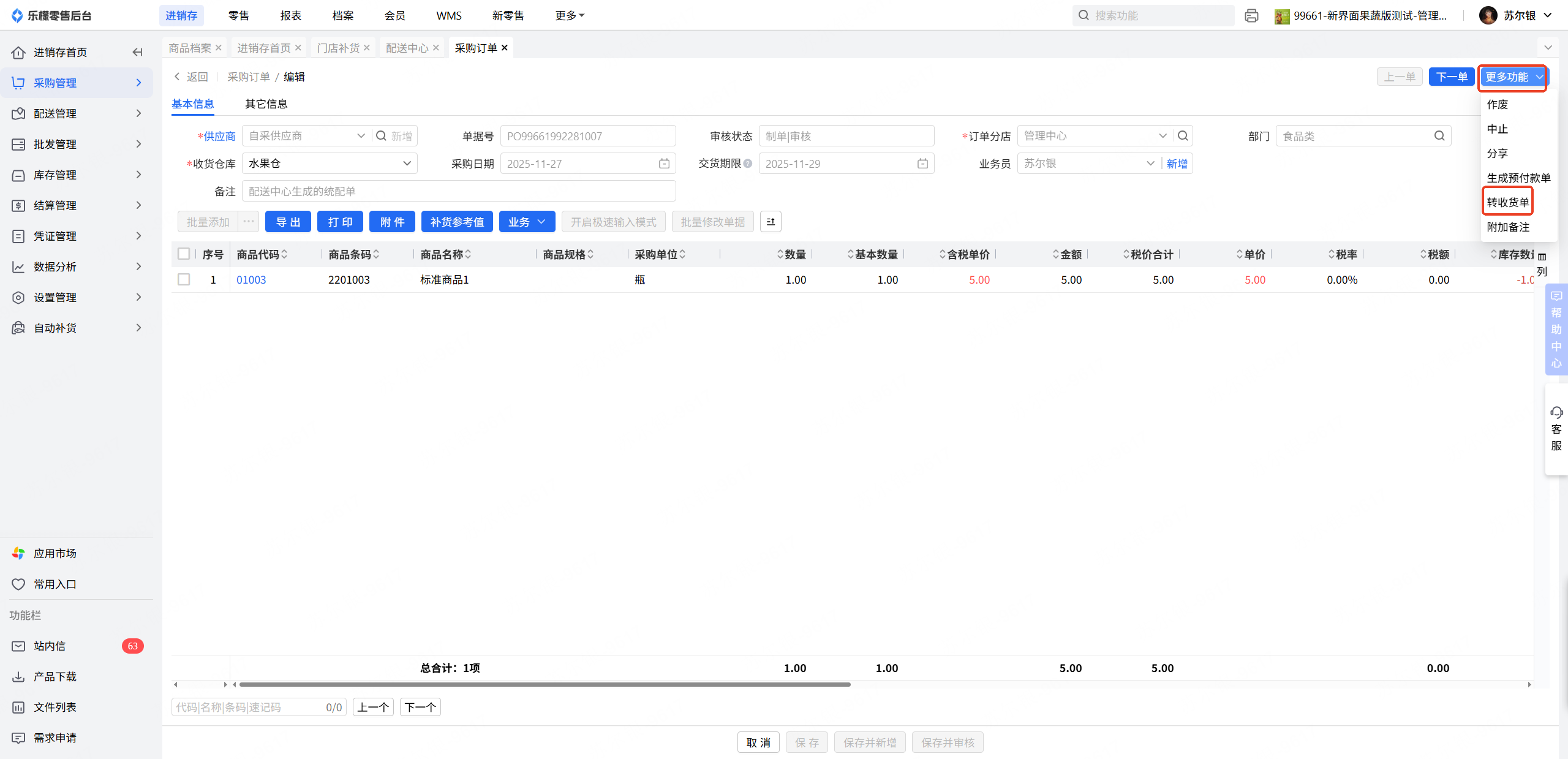 点击左上角更多功能-转收货单,进入收货操作。收货单路径:进销存-采购管理-收货单。