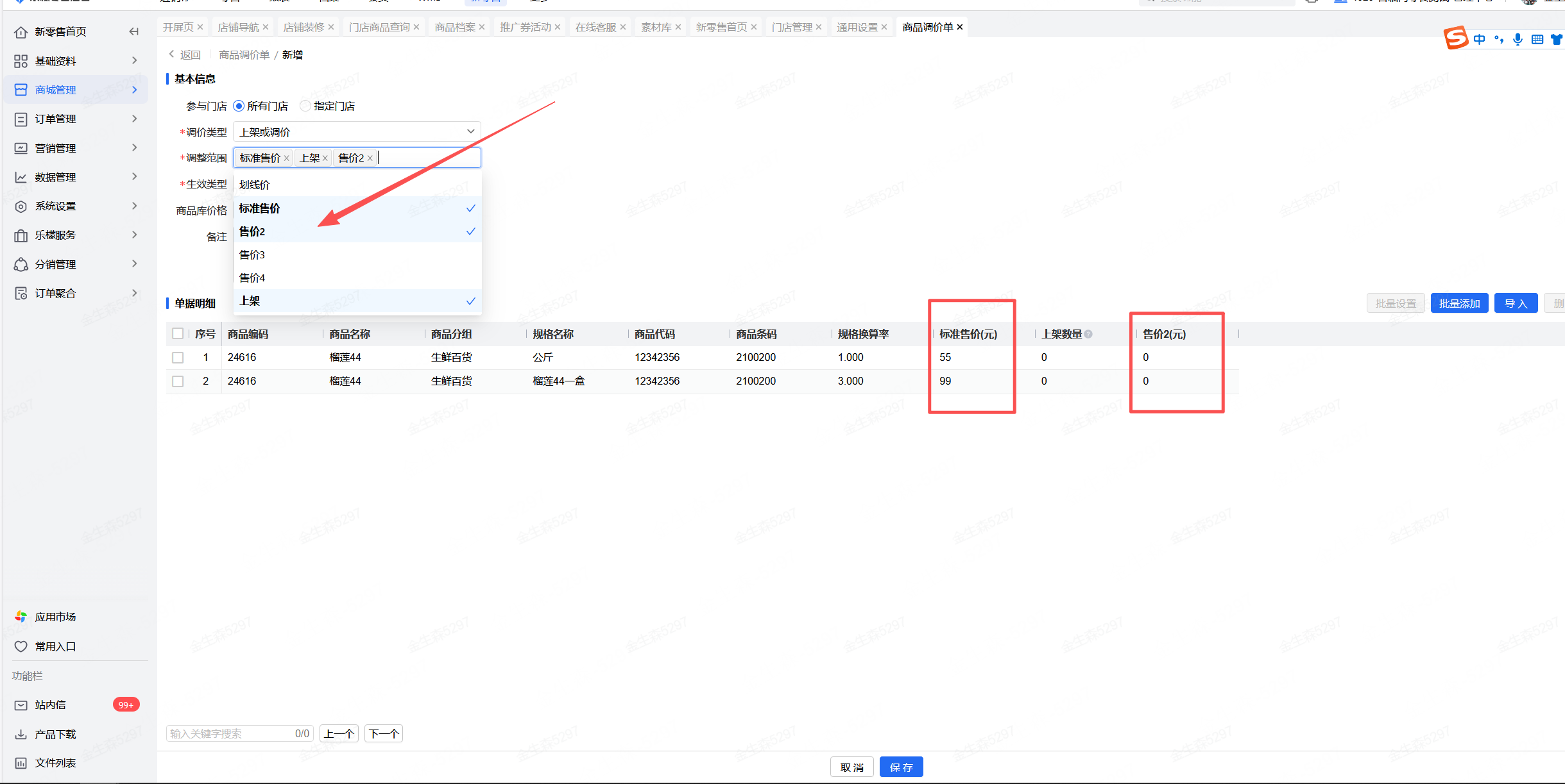 商品调价单中调整范围添加上“售价2”,并确保设置的会员价比标准价低