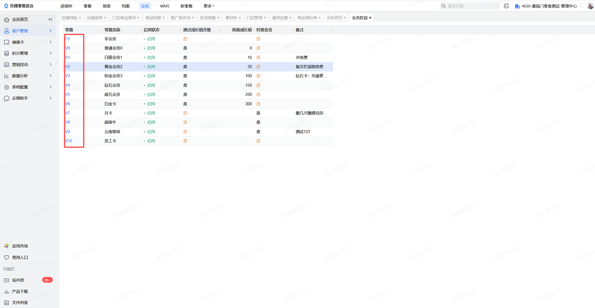F0为没有注册会员的用户,V0代表注册会员的用户,基本来说注册了小程序会员的用户都属于V0会员,点击V0等级进入会员等级详情进行编辑