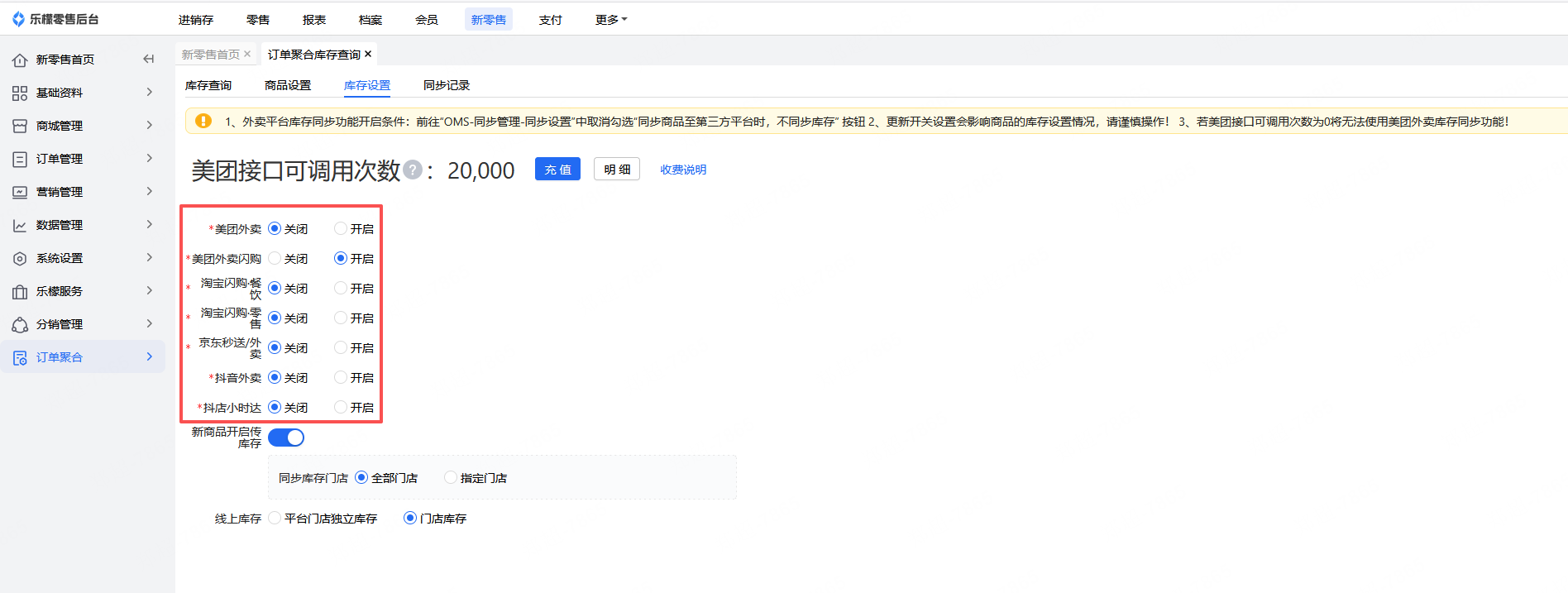 注:目前因美团外卖平台限制,在对美团外卖进行库存同步时需要收取API接口费用,若有同步美团外卖平台,需进行充值接口次数,充值后可正常使用库存同步,其他平台暂不收取