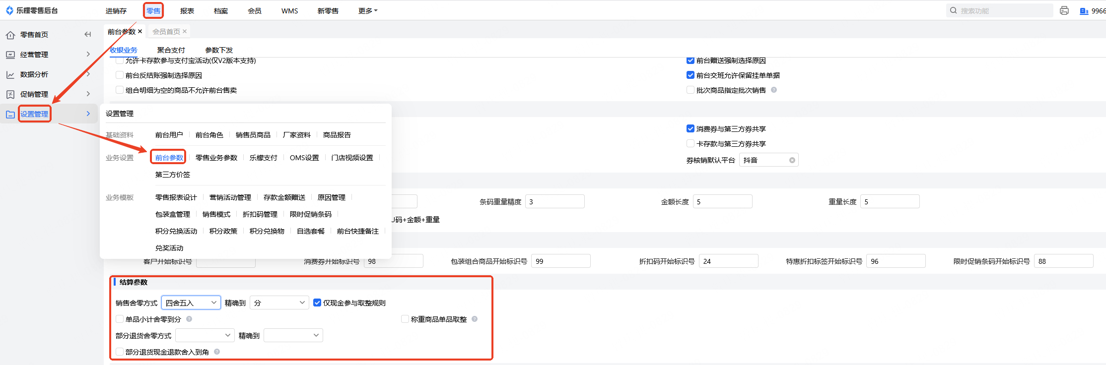👉【操作路径】:零售-设置管理-前台参数-结算参数