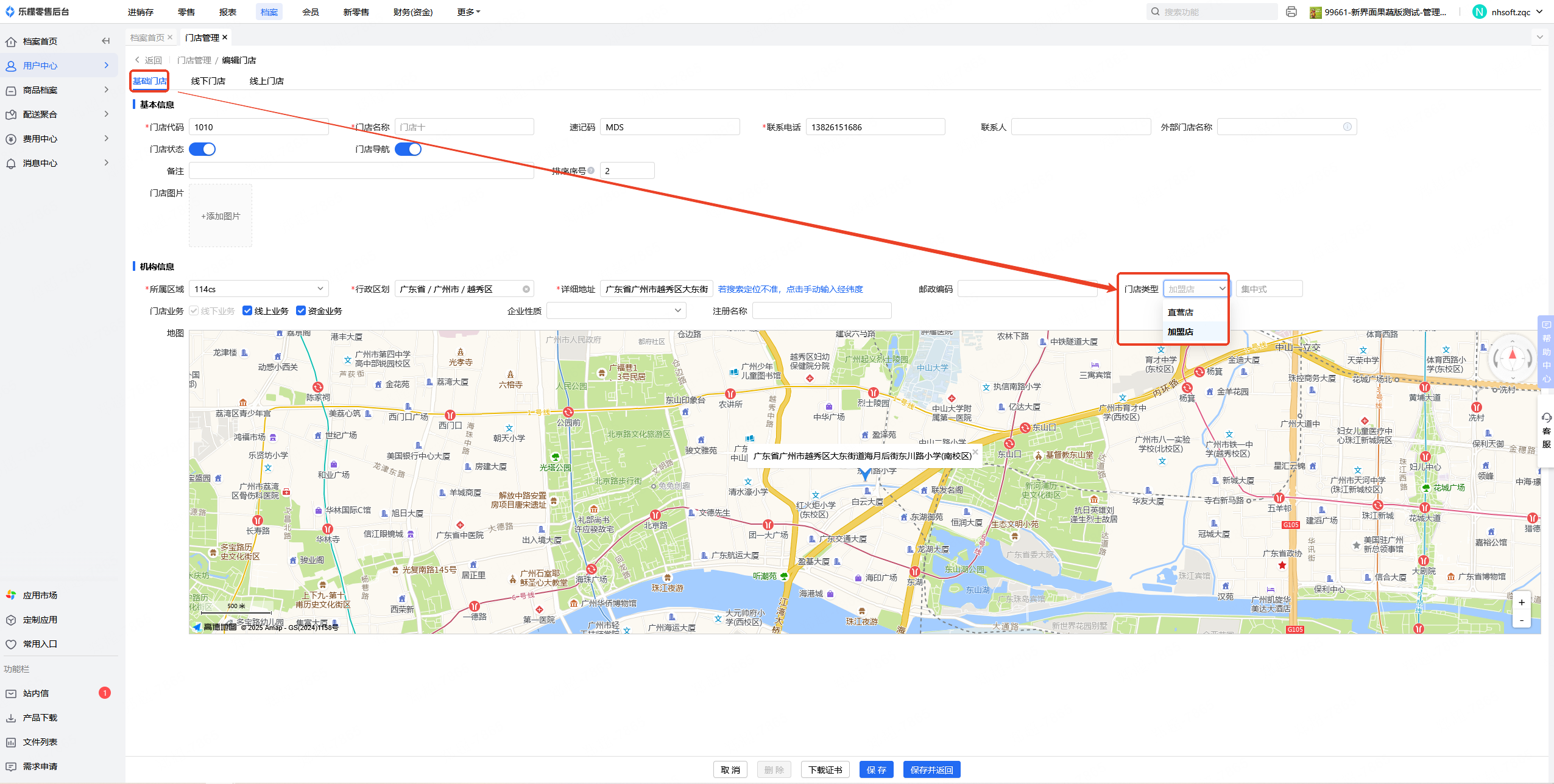 3.在“基础门店”资料中,门店类型修改成直营店/加盟店,点击保存