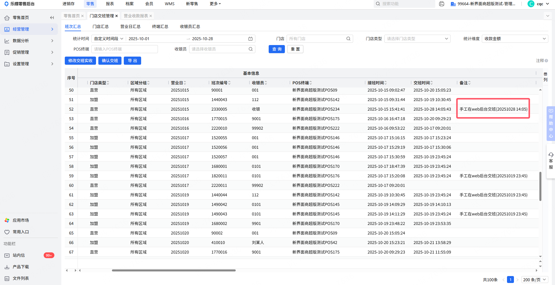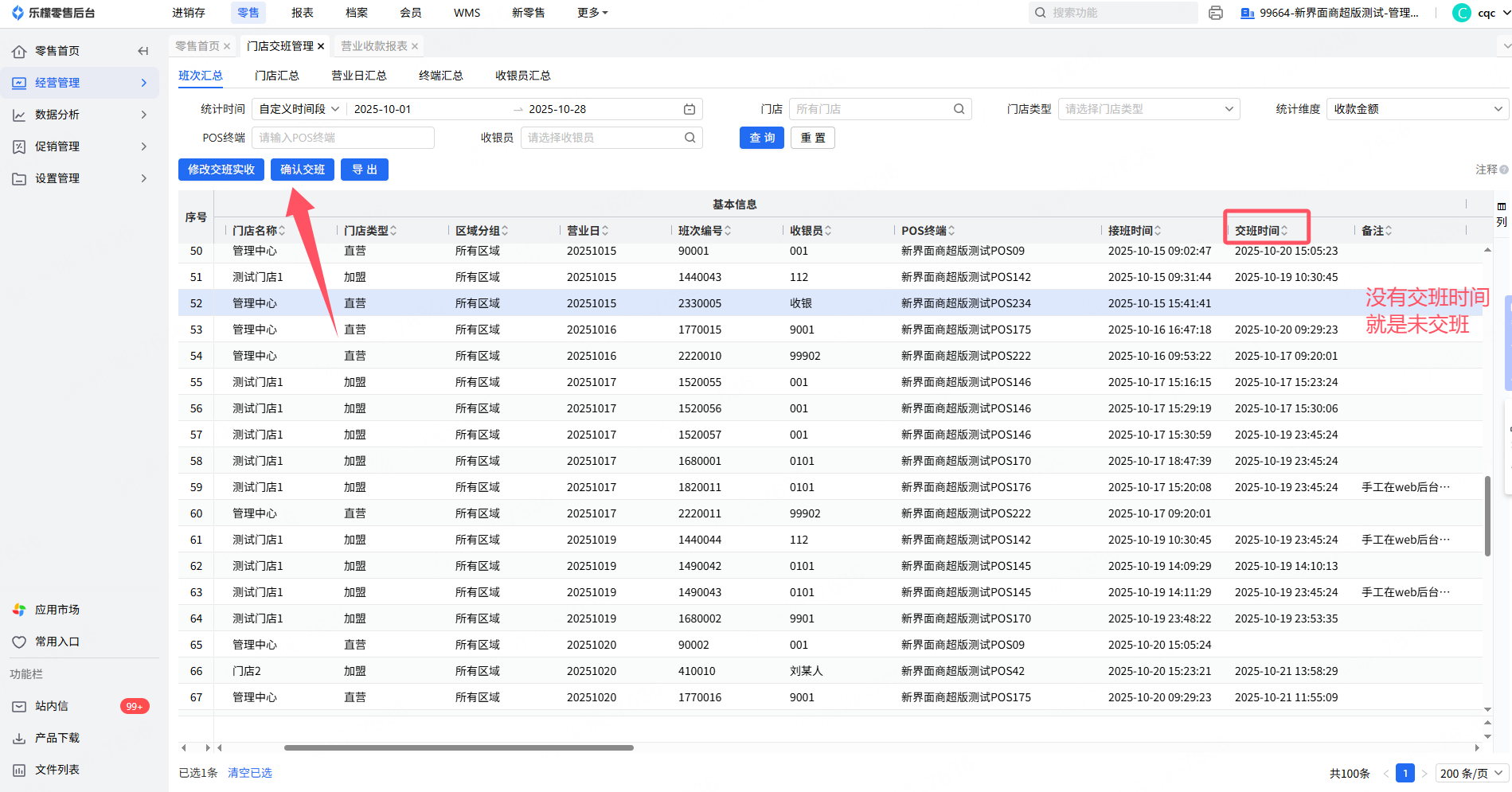 完成操作后点击查询,会显示交班时间,以及备注:手工在web后台交班(2025xxxx)