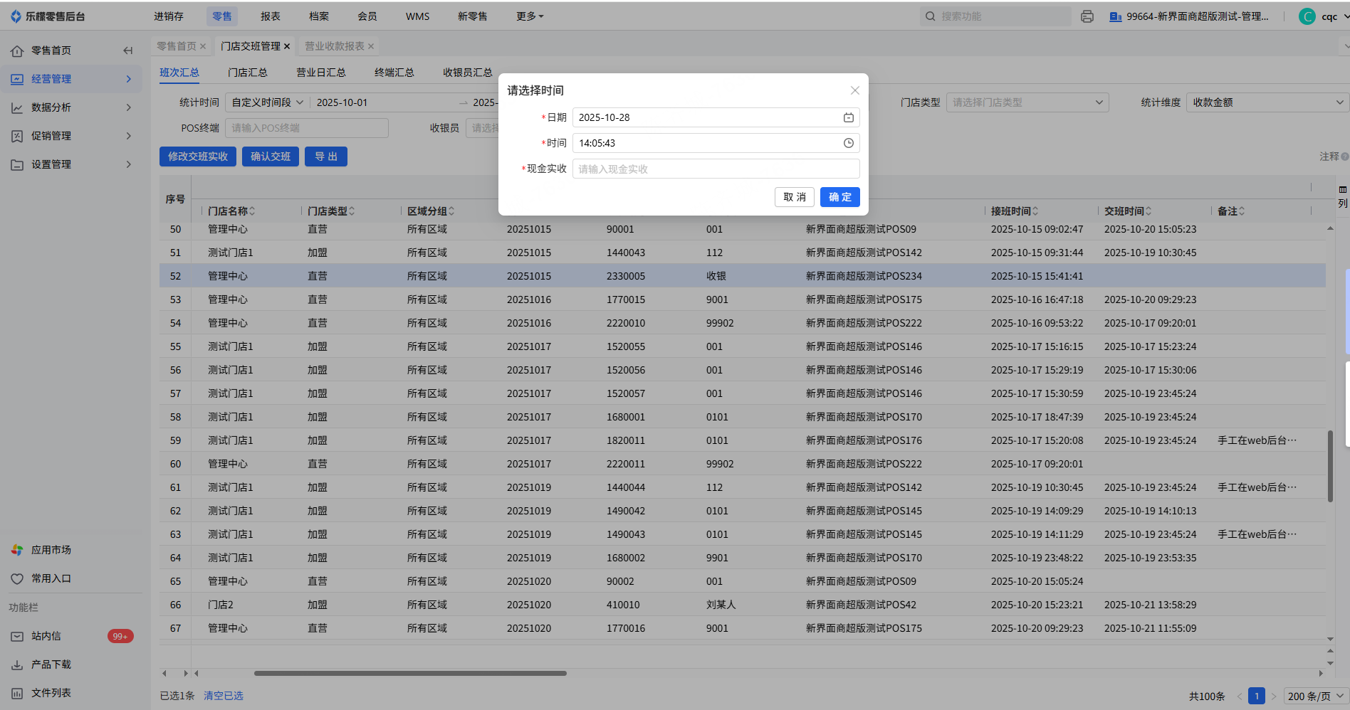 情况2:要到 零售-经营管理-门店交班管理,选择班次汇总,找到成本结转提示的未交班的日期和班次,选中 点击 确认交班。选择对应的日期时间和现金(一般是这一天的营业结束时间)点击确定