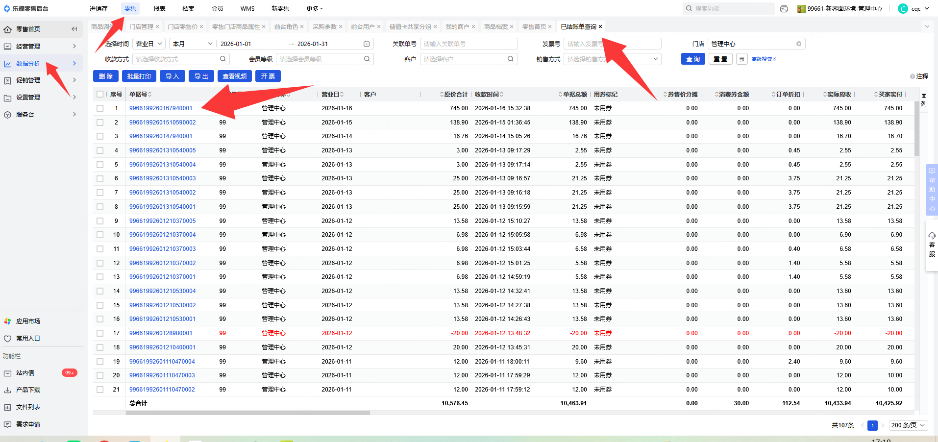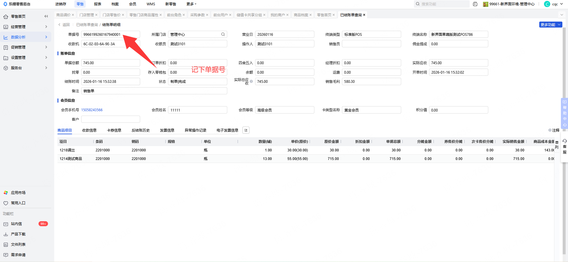 👉【操作路径】:零售-数据分析-已结账单查询(根据日期,客户手机号,购买的商品或者时间等筛选条件找到这一单)