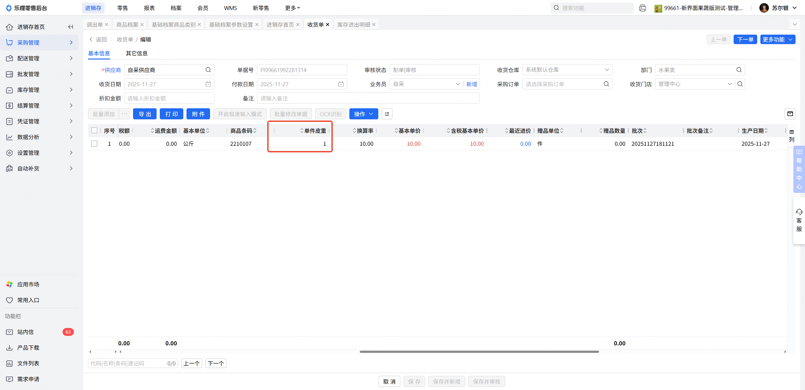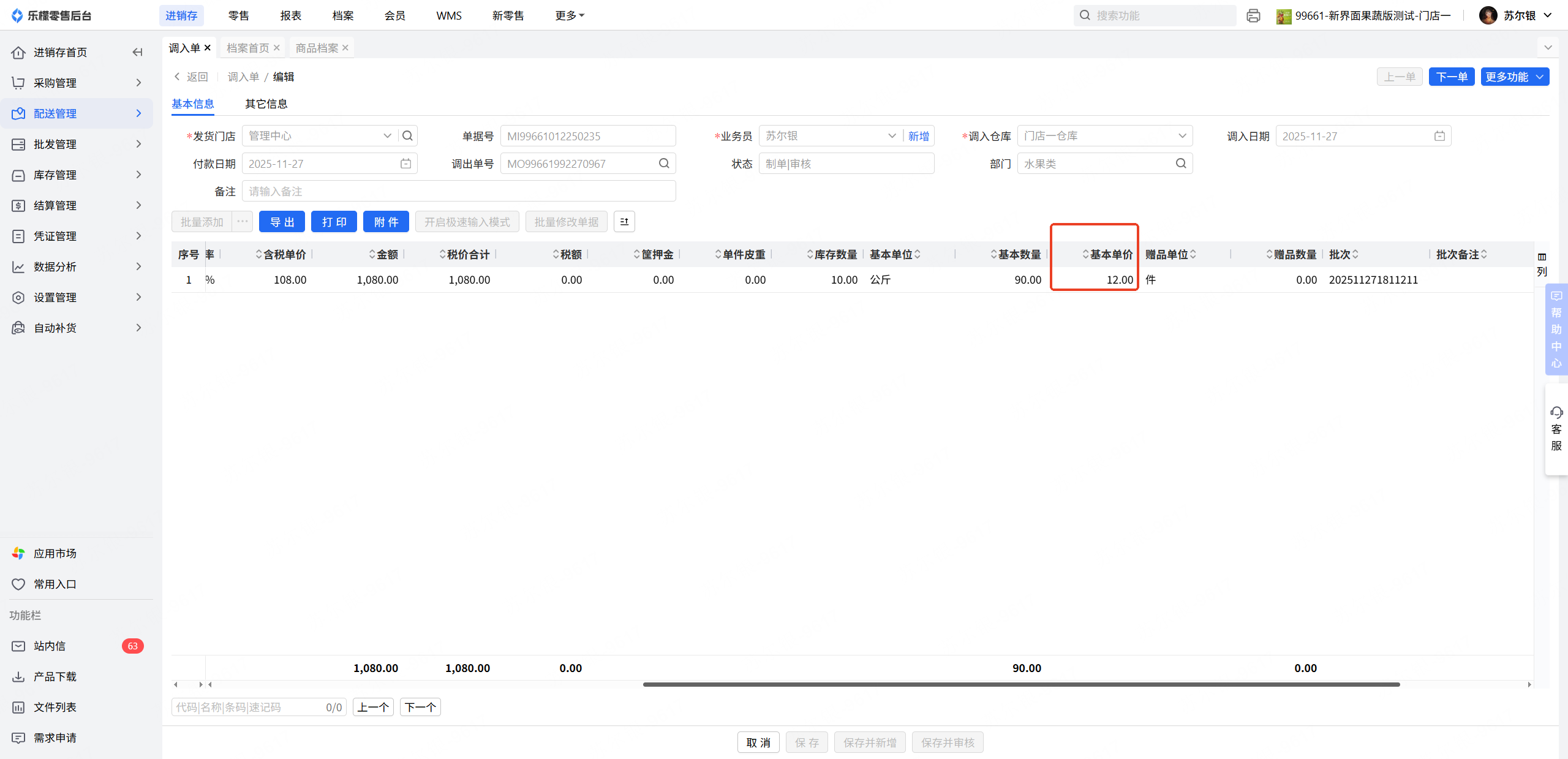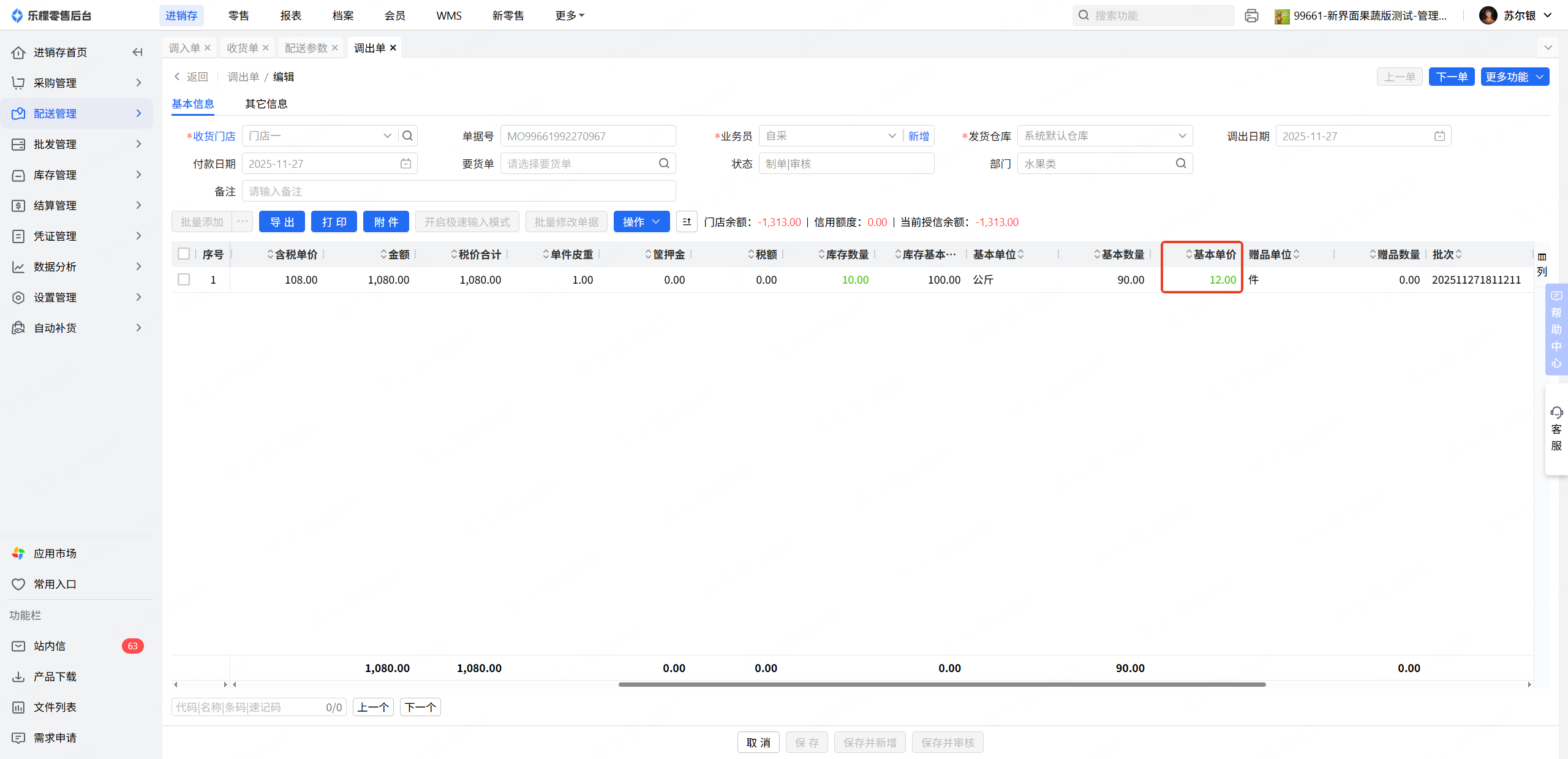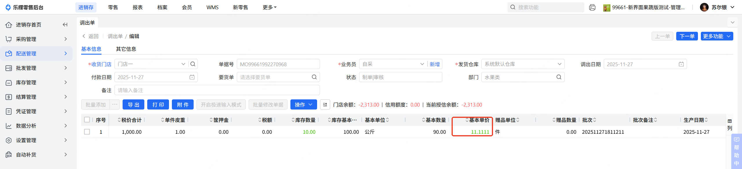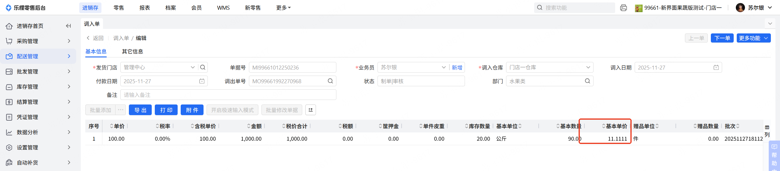 2.调出单配送价100,调出10件,调出单审核后,去皮参数,扣减10公斤皮重,净重90公斤,少了皮重的数量。调出单单价变成了1000/90=11.11,门店最终入库情况为,净重数量90公斤,金额1000,也是按照基本单价11.11入库