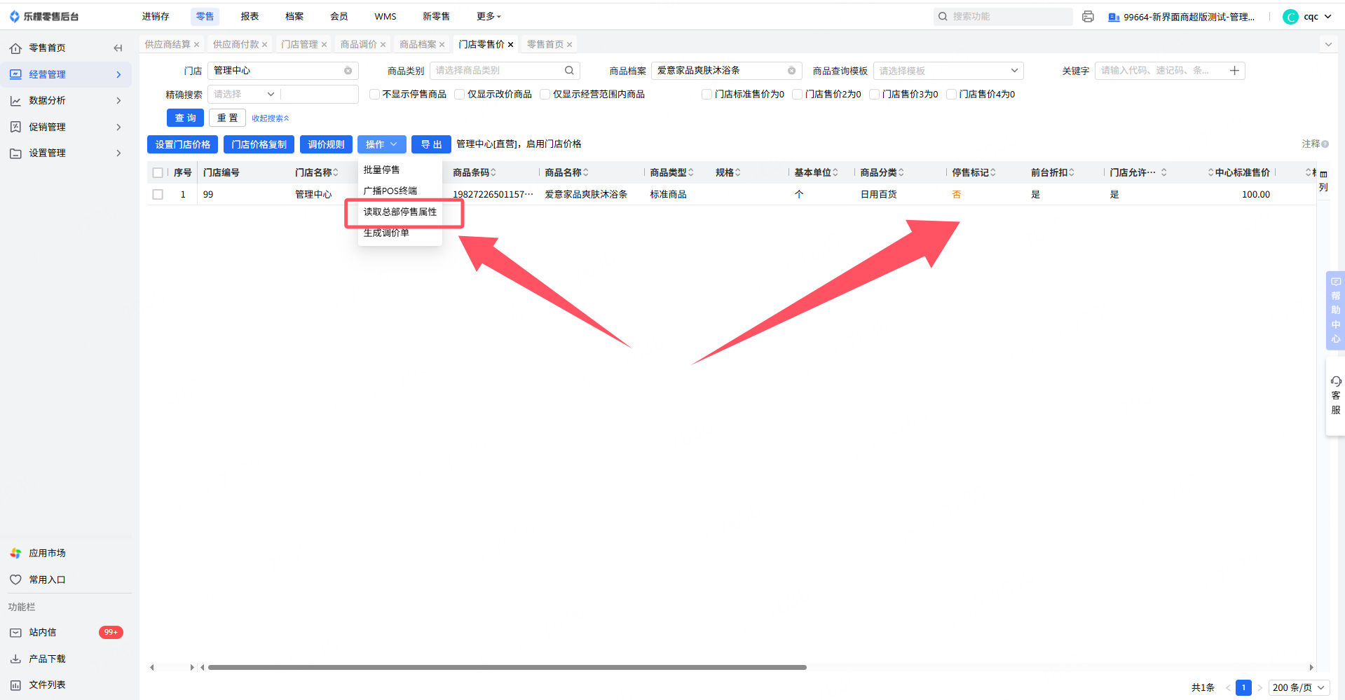 2.那怎么样能再次随档案的停售变动走呢,需要点下门店零售价里的读取总部停售属性就恢复正常了