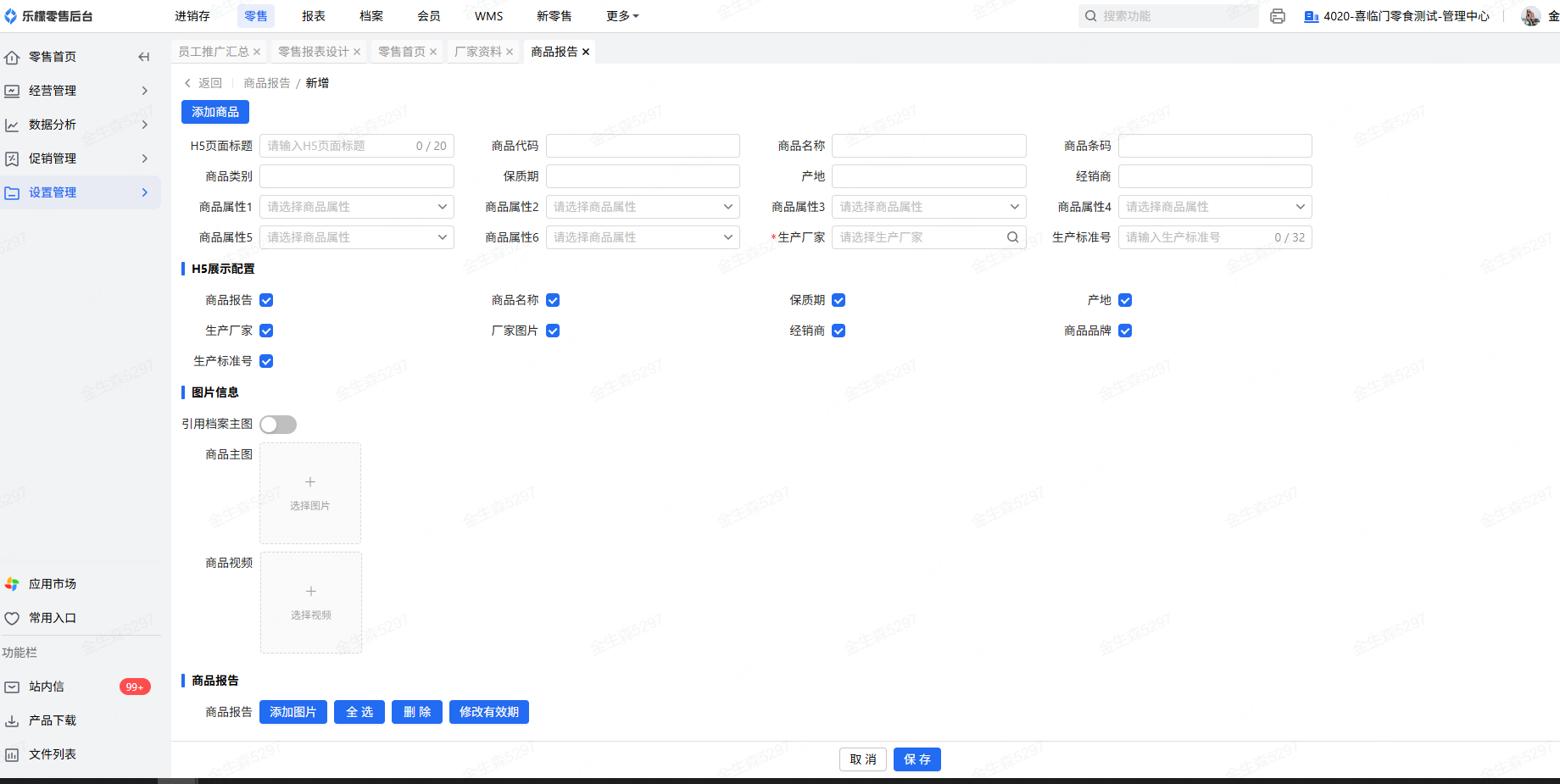 后台零售-设置管理-商品报告-新增,选择对应商品,上传商品资料,如图片、视频、其它官方报告信息,还有厂家等