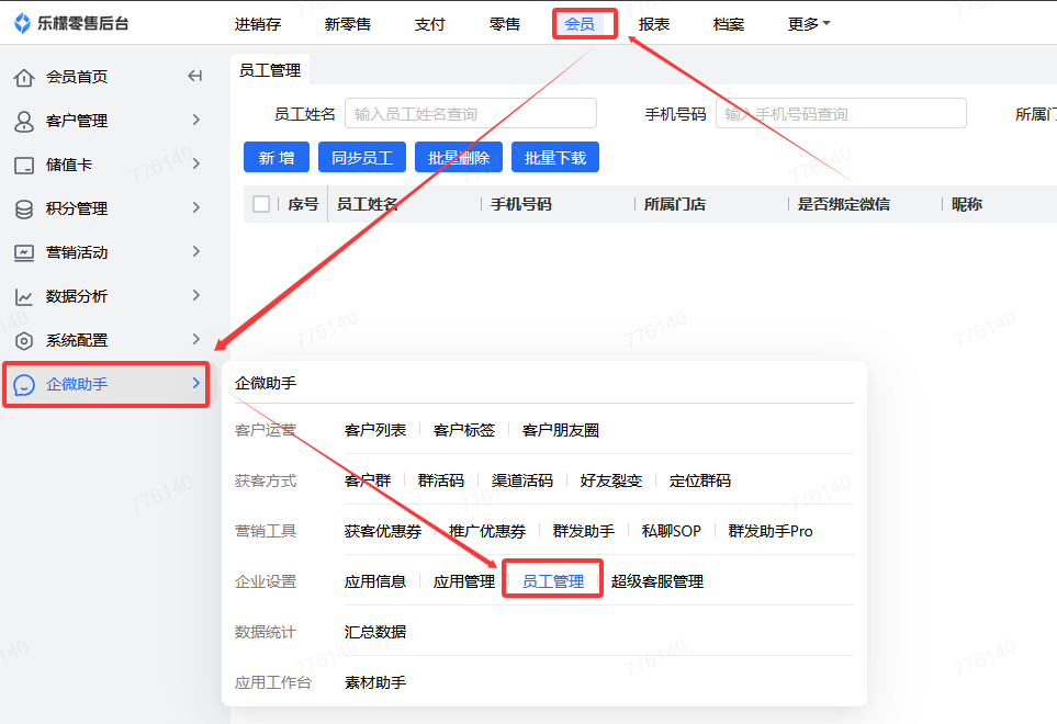 服务顾问在会员-企微助手-员工管理-新增或删除