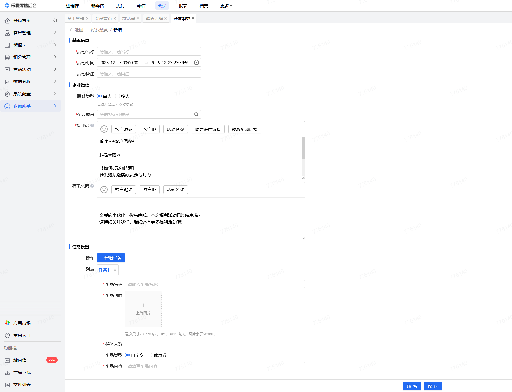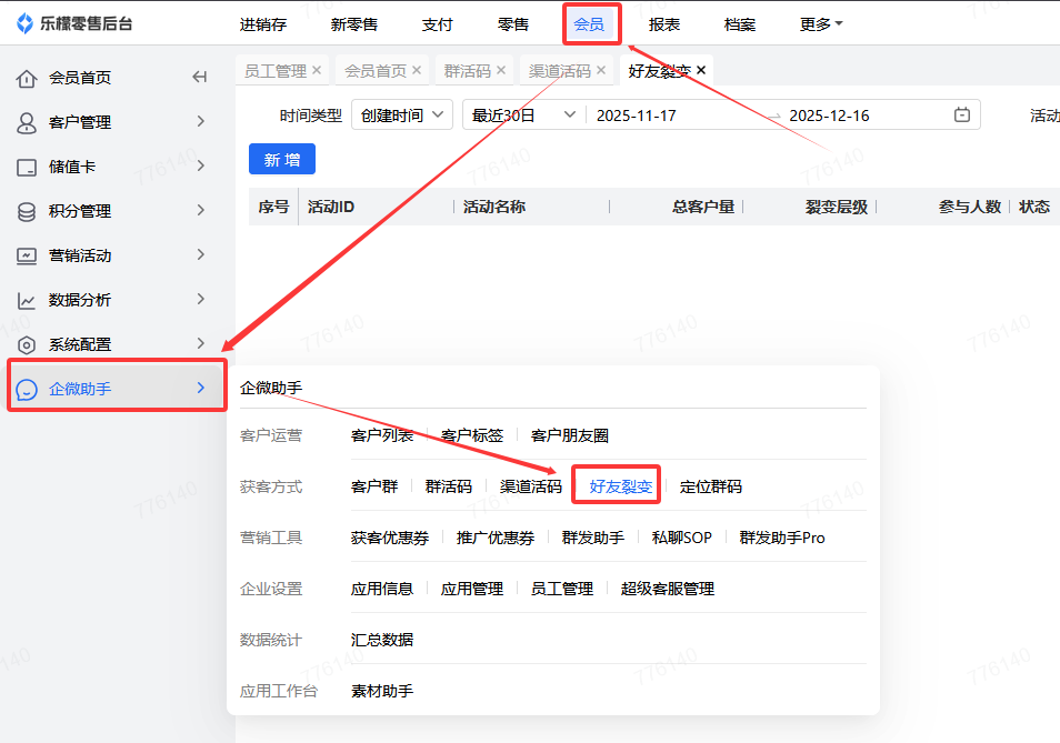👉【操作路径】:会员-企微助手-获客方式-好友裂变-新增