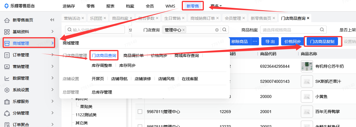 👉【操作路径】:新零售-商城管理-门店商品查询-门店商品复制