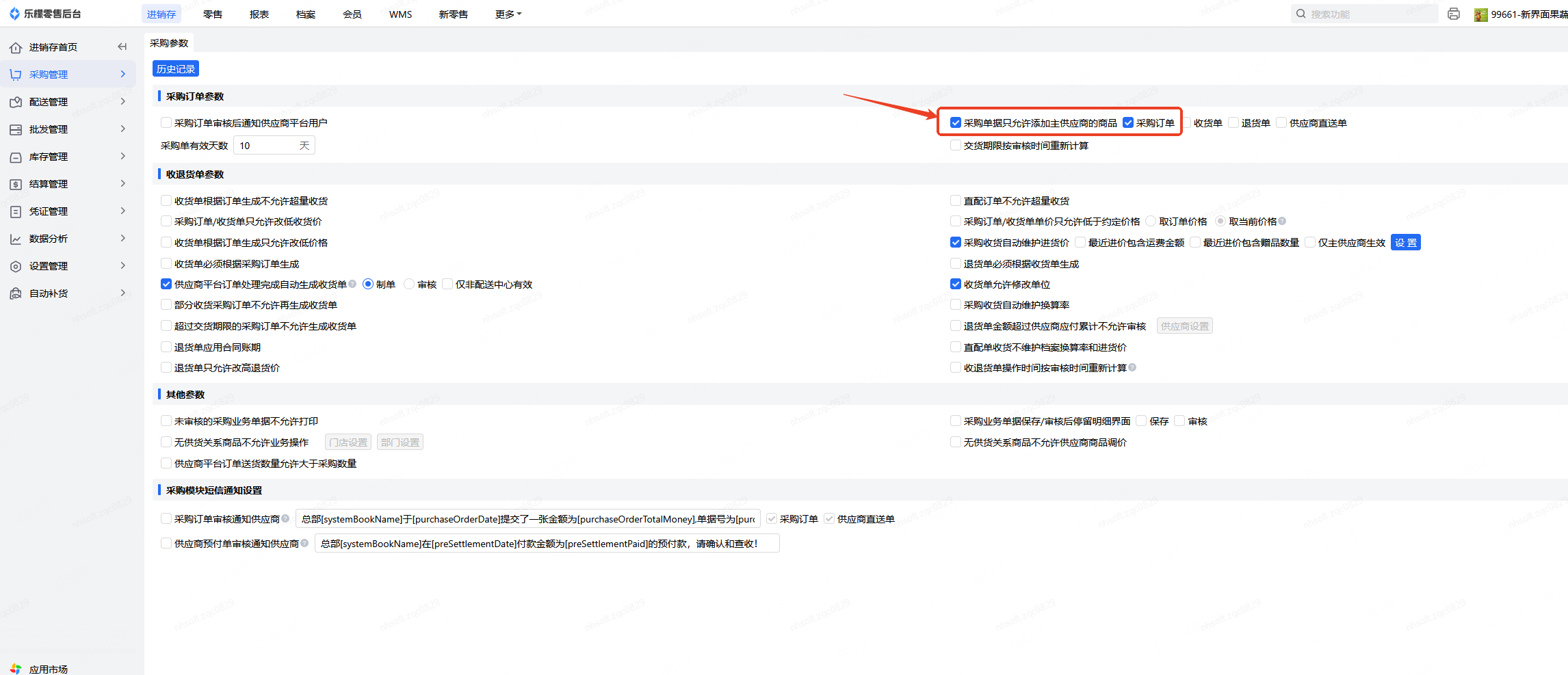 👉【操作路径】:进销存-采购管理-采购参数-采购单据只允许添加主供应商的商品