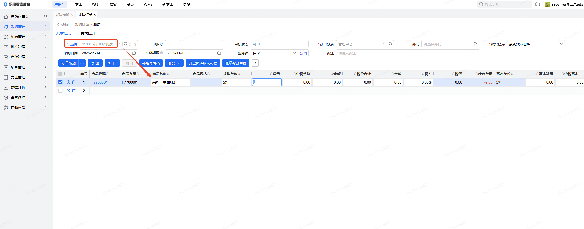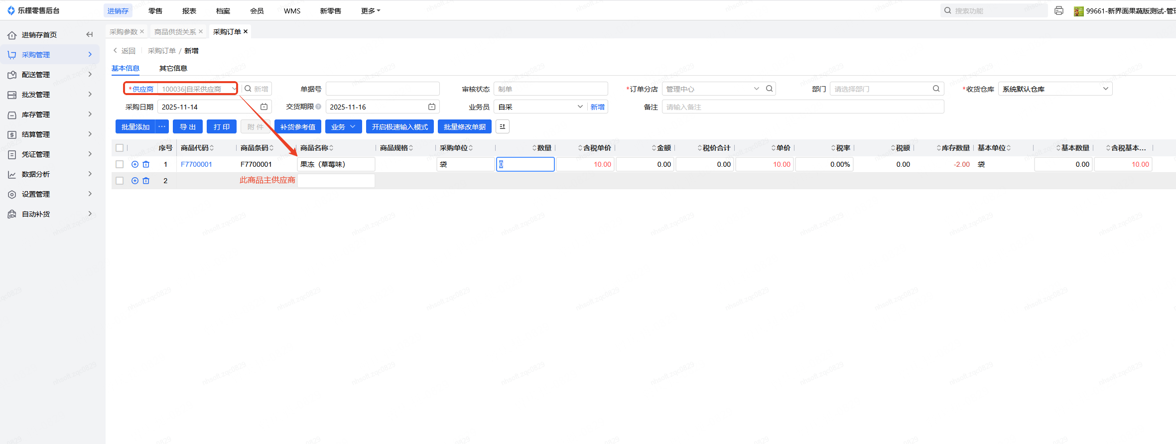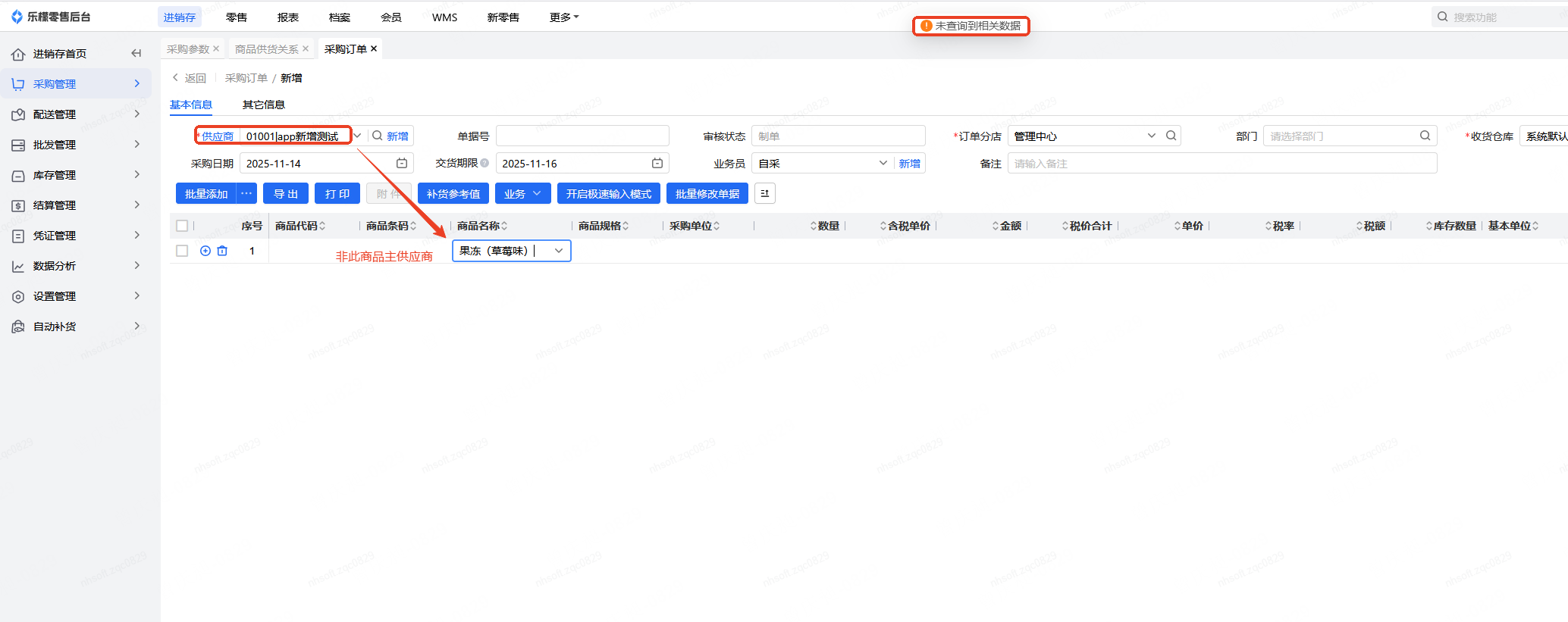 即使当前商品与当前供应商无供货关系,也可以添加到订单中进行采购收货