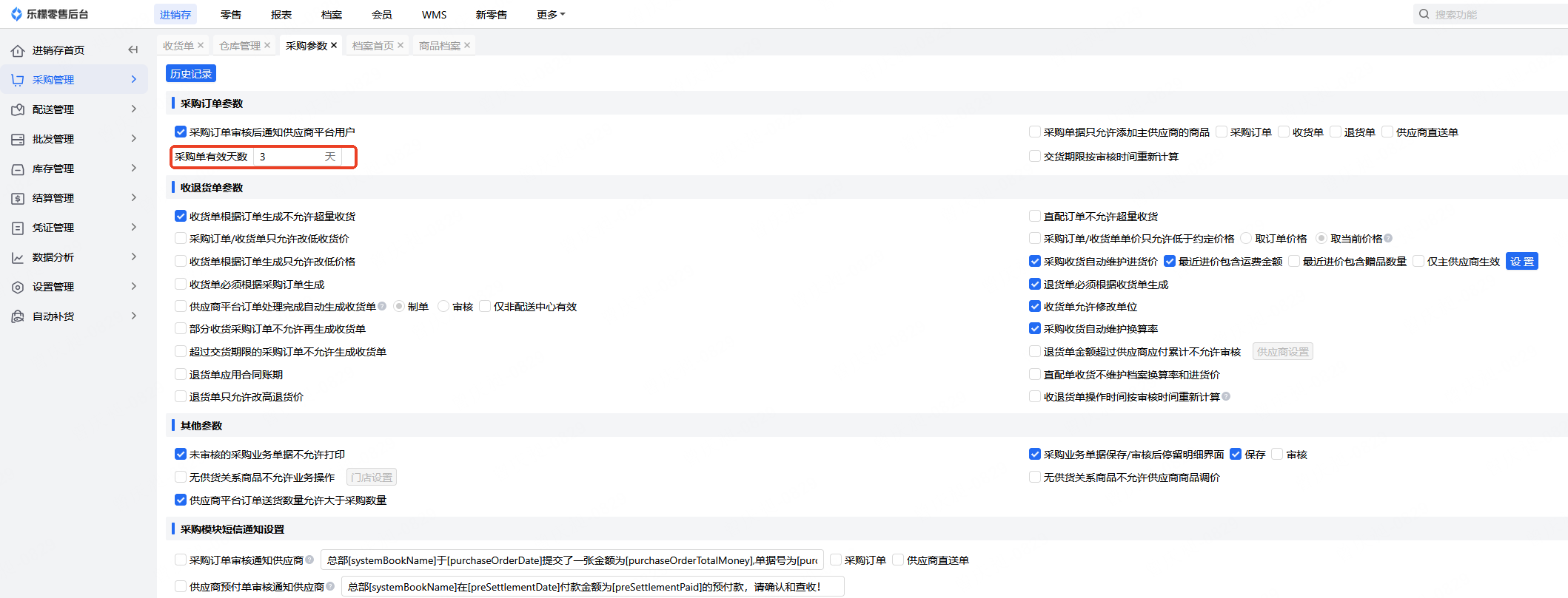 👉【操作路径】:进销存-采购管理-采购参数-采购单有效天数