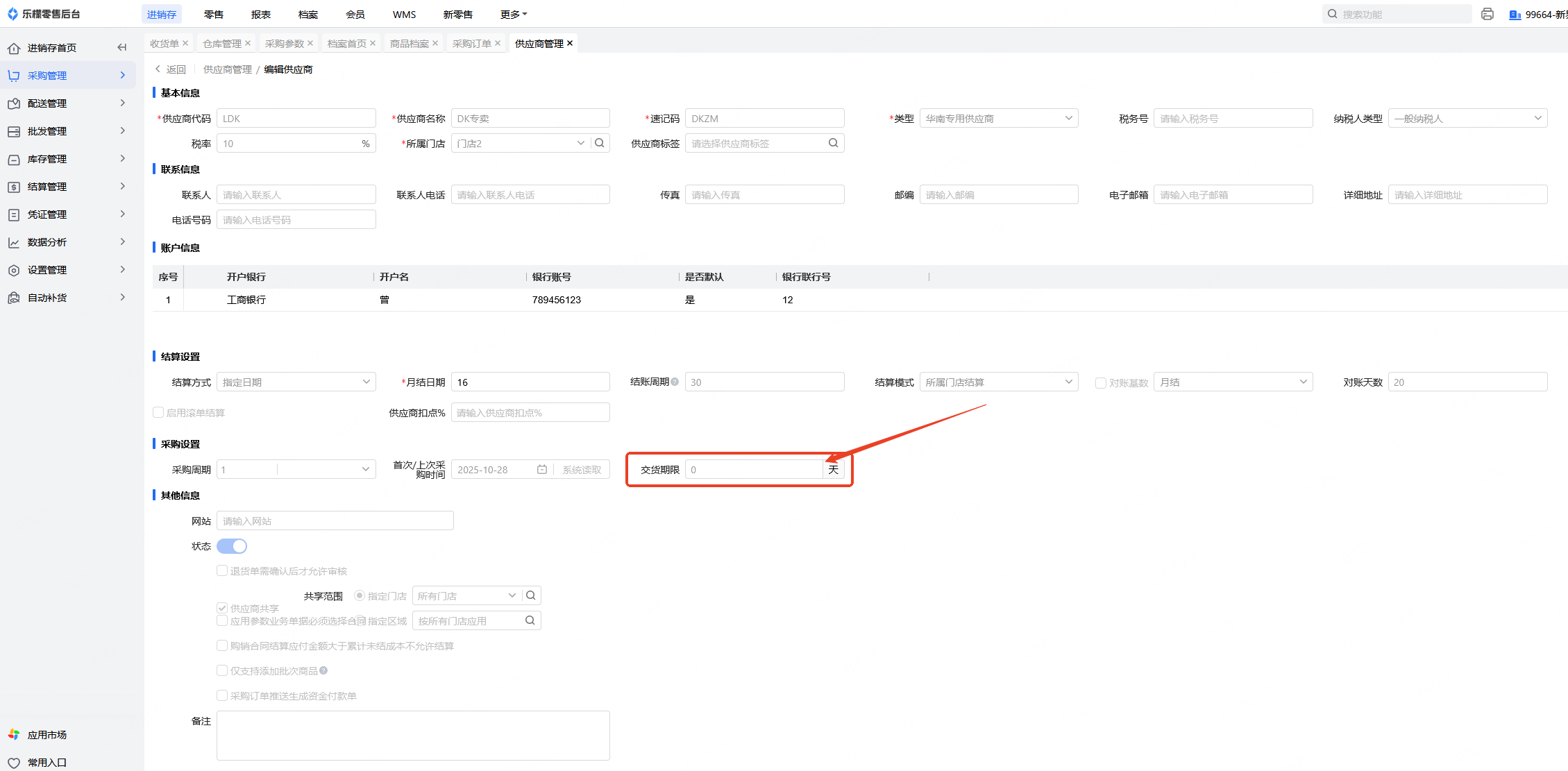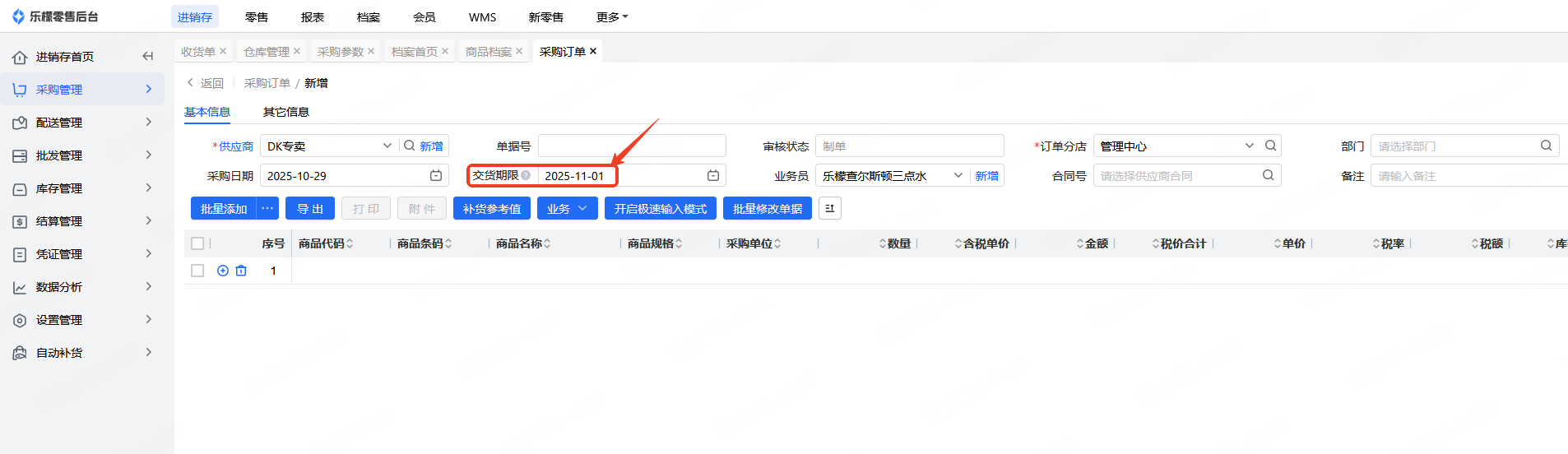 参数开启后,交货期限的日期自动生成为添加有效天数后的日期,若在供应商中单独设置了交货期限,则优先读取供应商中的交货期限