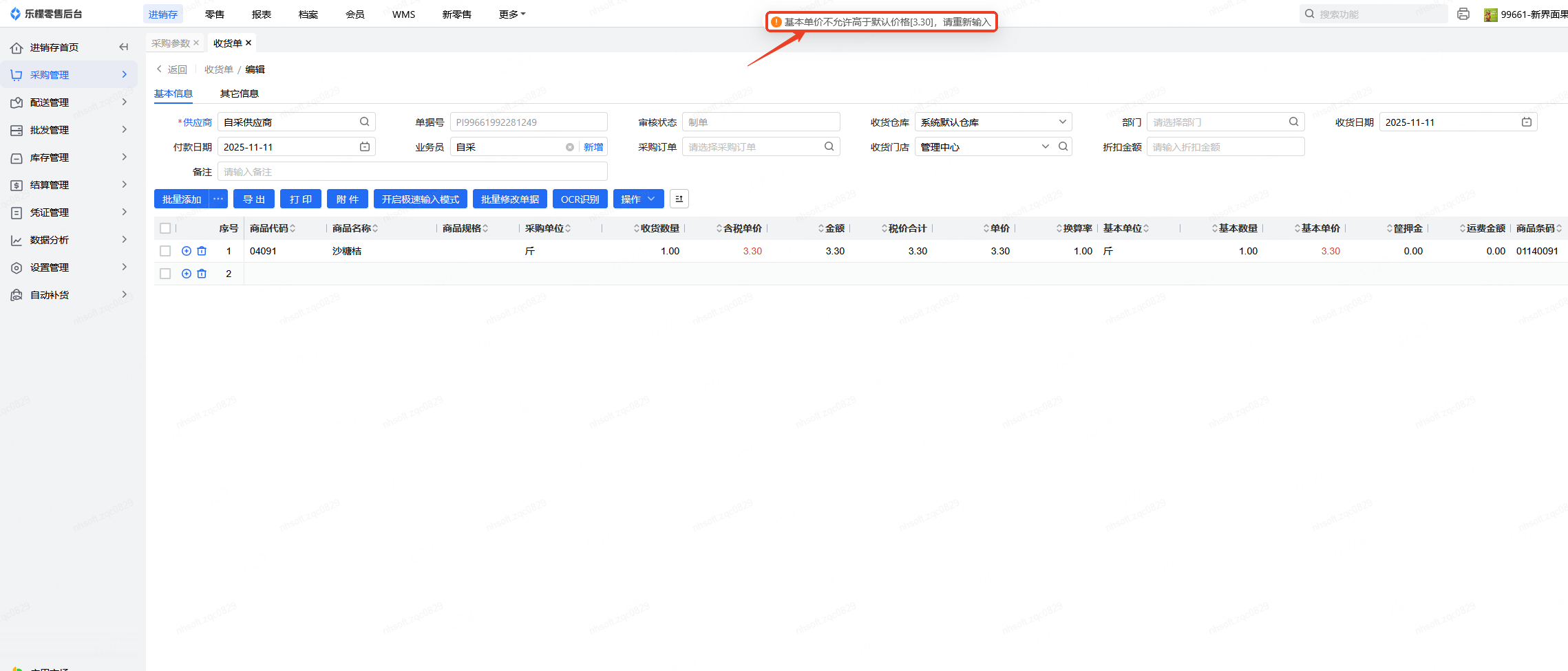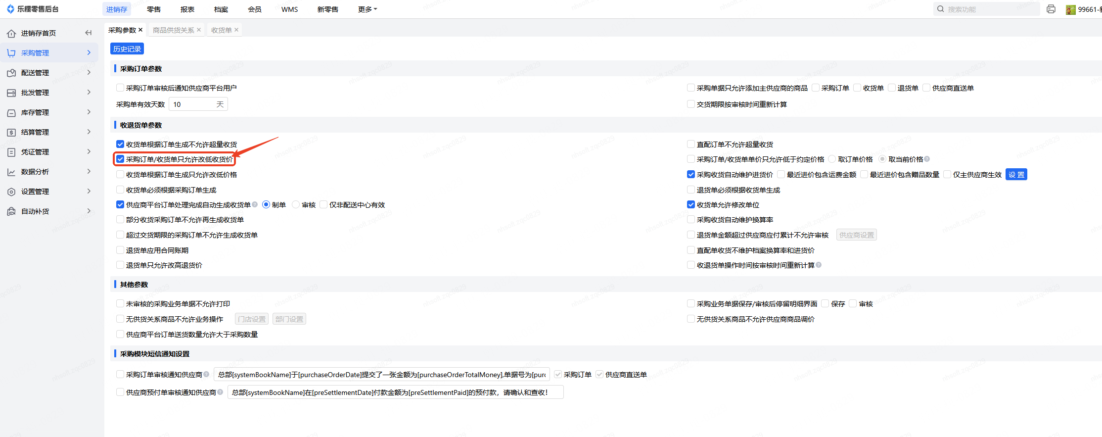 👉【操作路径】:进销存-采购管理-采购参数-收货单根据订单生成只允许改低价格