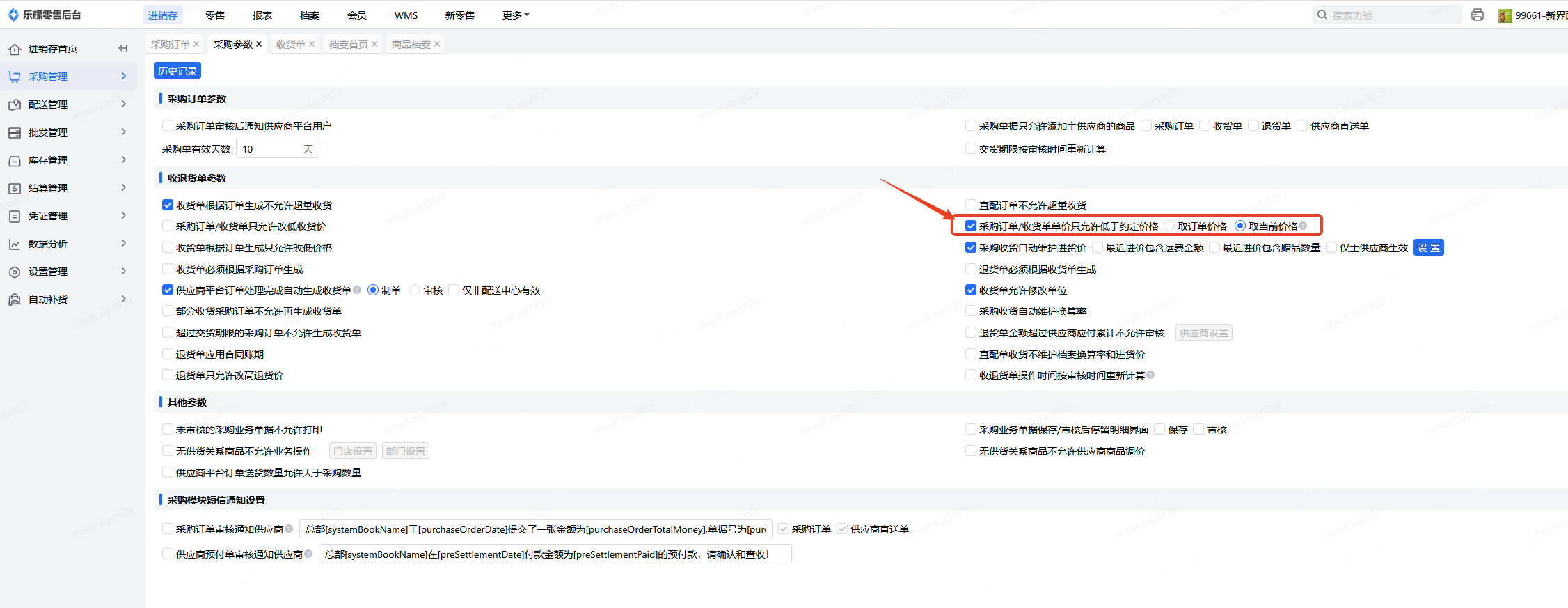 👉【操作路径】:进销存-采购管理-采购参数-采购订单/收货单单据只允许低于约定价格