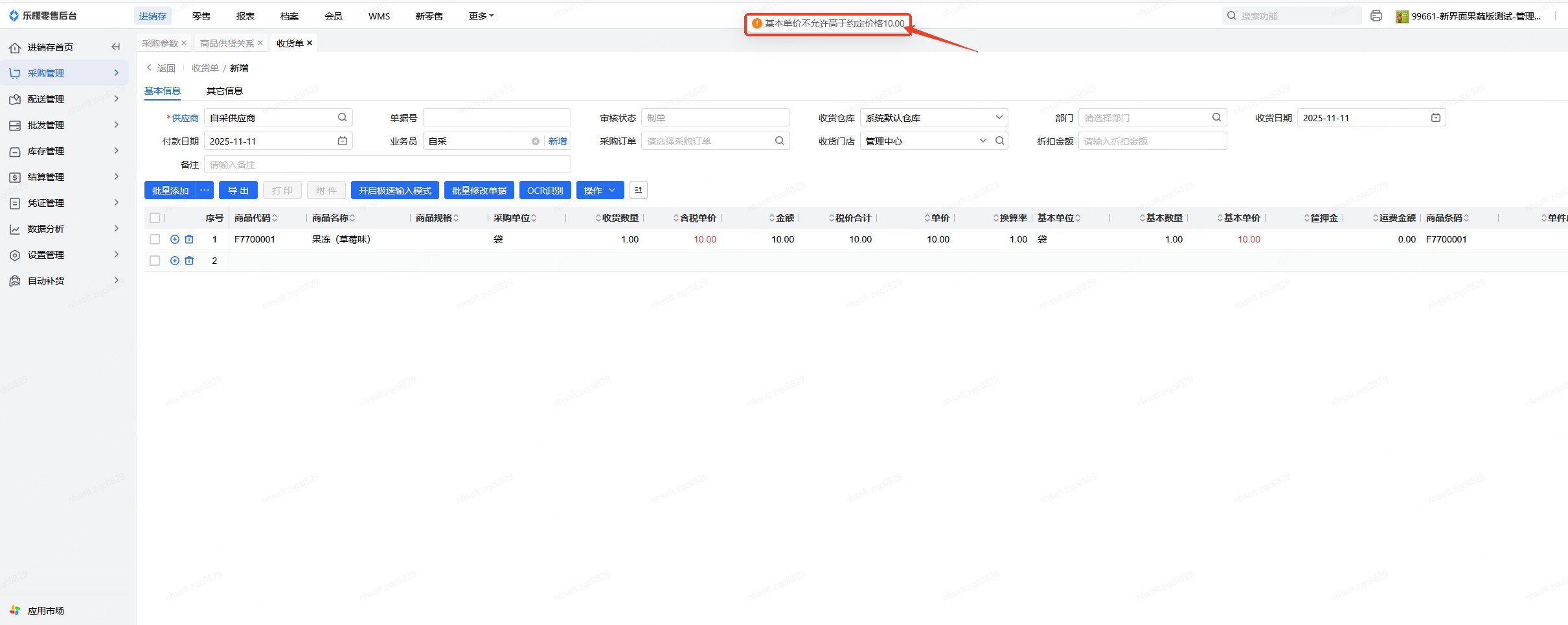 商品与供应商谈价完毕后确认了一个最终的进货价,即约定价格,商品在系统中设置约定价格后, 开启此参数时,若采购订单、收货单的单价金额比约定价格高,则会进行报错提示