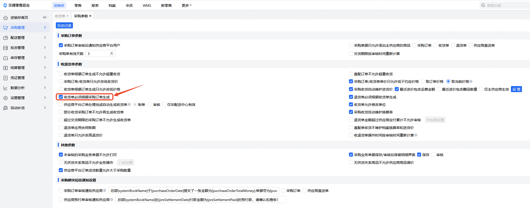 👉【操作路径】:进销存-采购管理-采购参数-收货单必须根据采购订单生成
