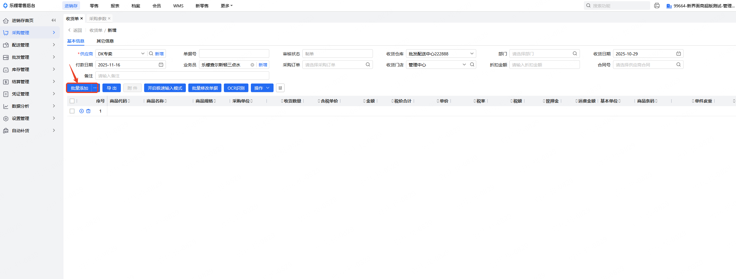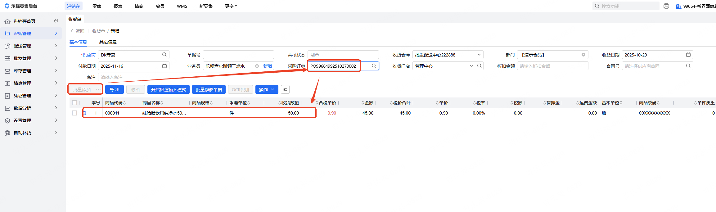 未开启参数时,可直接新增收货单并添加收货商品直接收货