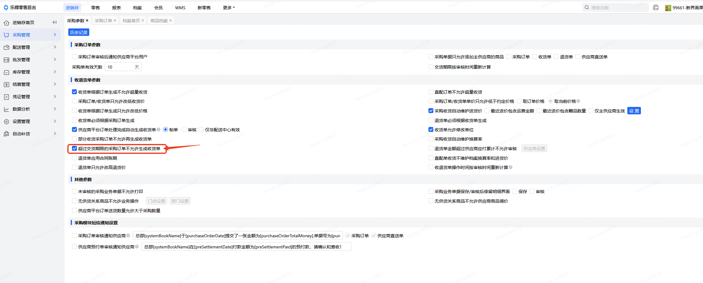 👉【操作路径】:进销存-采购管理-采购参数-超过交货期限的采购订单不允许生成收货单