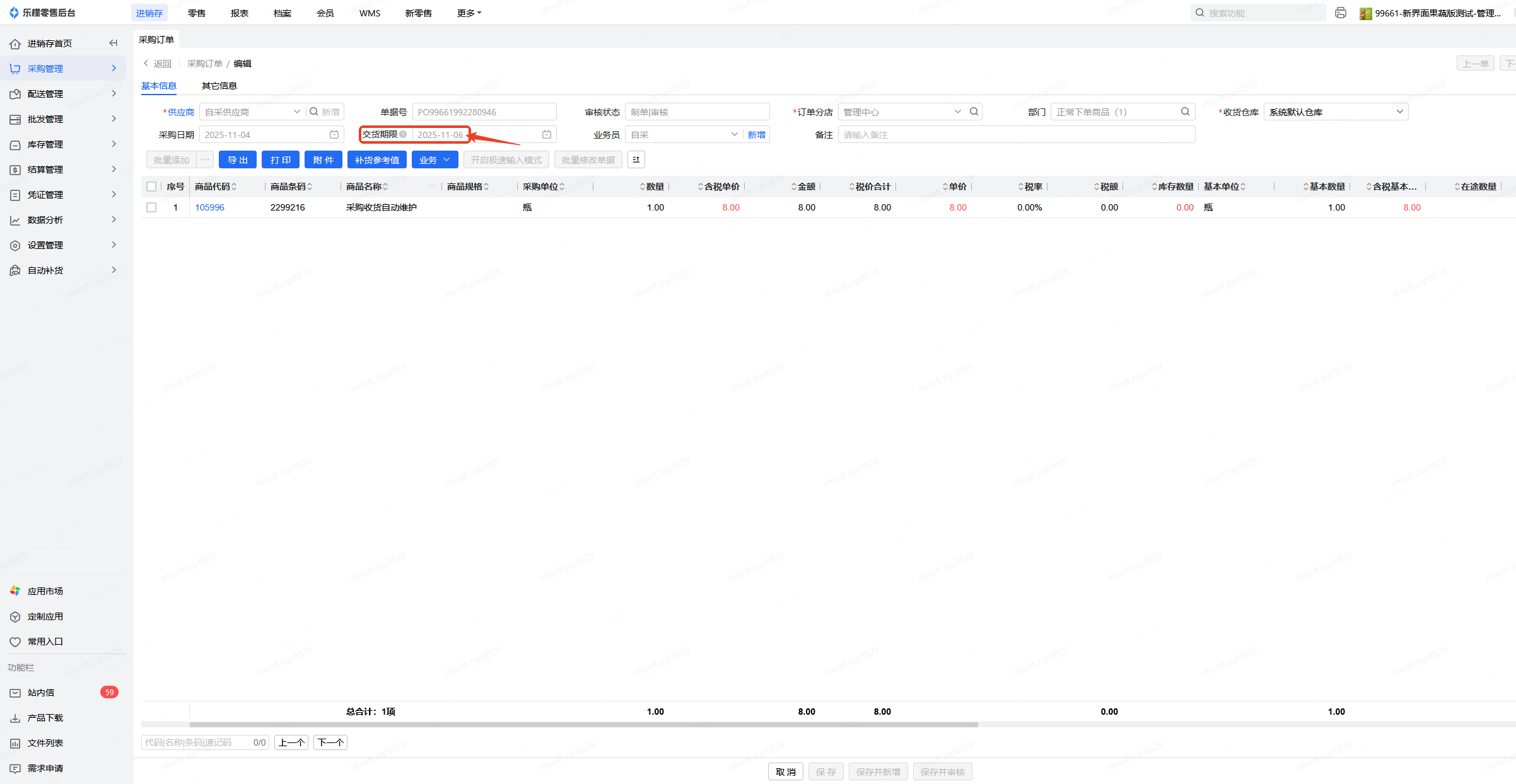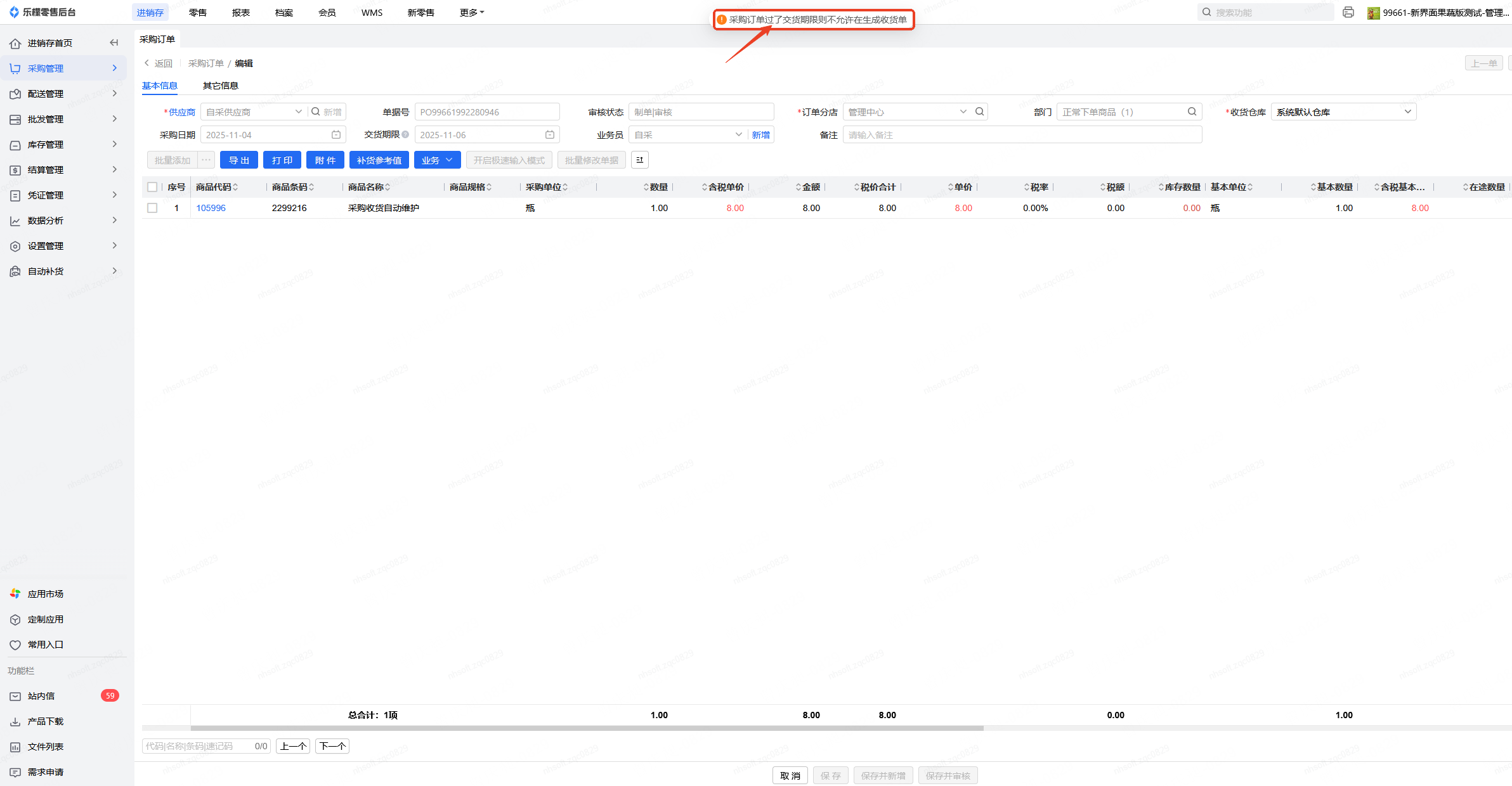当与供应商约好商品交付日期后,但供应商商品一直没有送到,当短期爆品热度已经消散后已经不需要此商品了,需要正常拒收且不允许入库,可通过此参数控制:超过交货期限的采购订单在收货单界面选择完订单点击确定时,提示“超过交货期限的采购订单不允许生成收货单”
