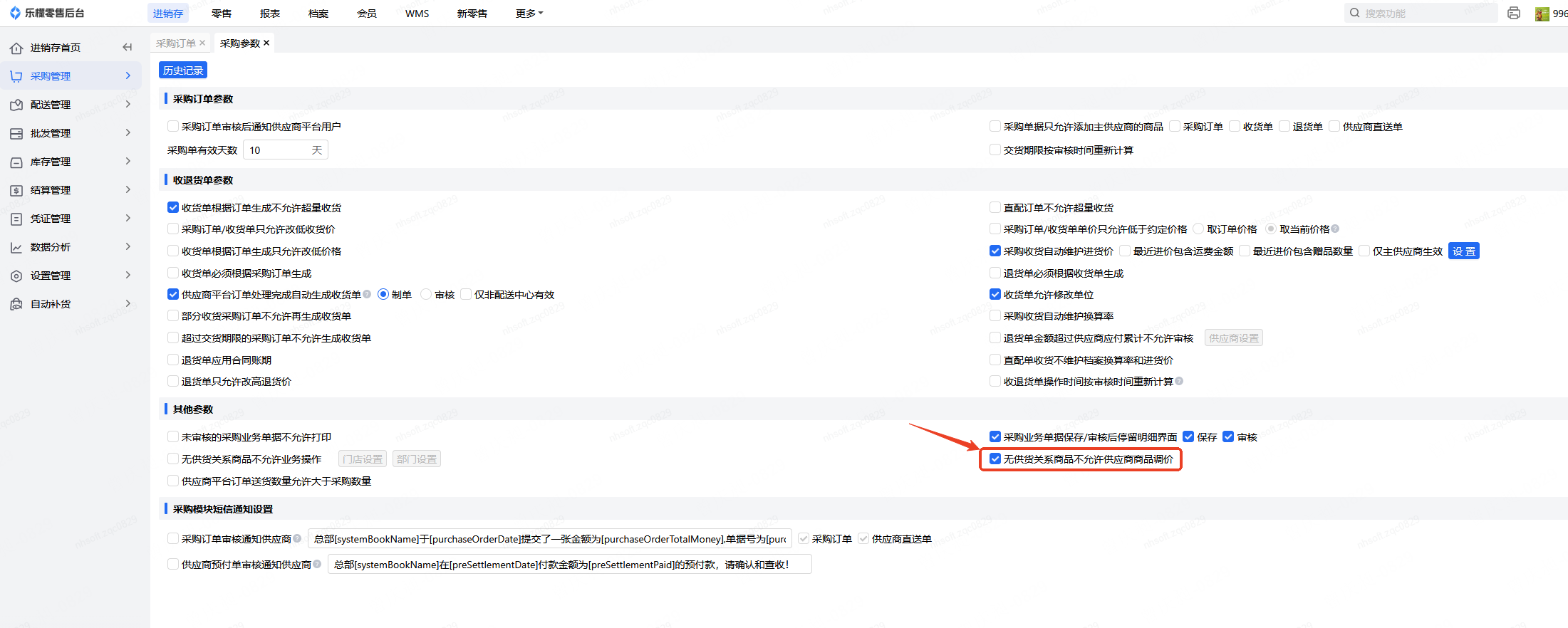 👉【操作路径】:进销存-采购管理-采购参数-无供货关系商品不允许供应商商品调价