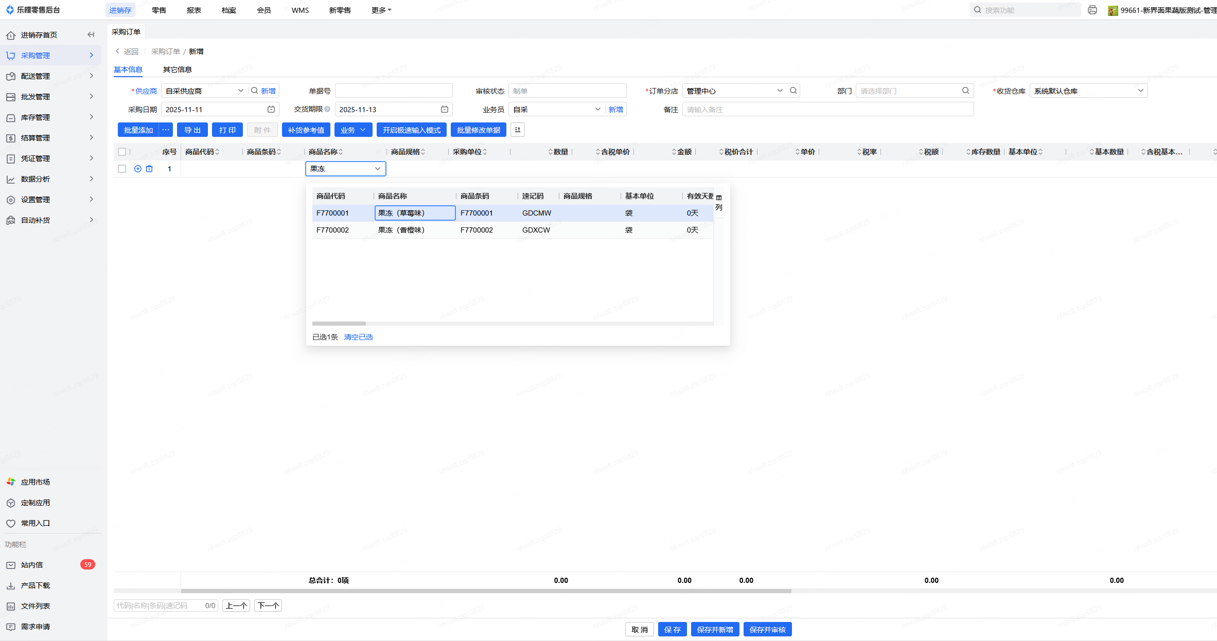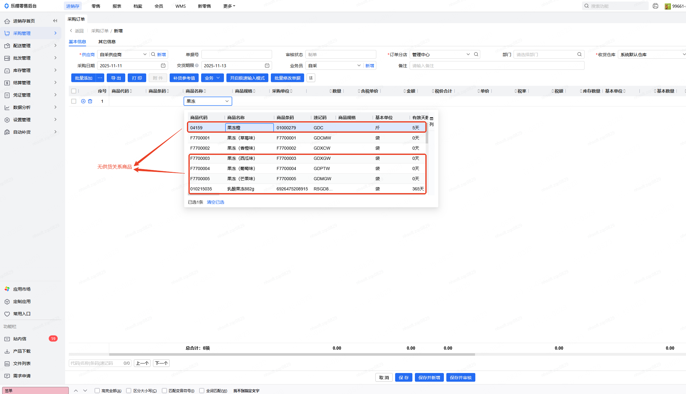 开启参数后,无供货关系的商品在商品明细界面输入名称将无法添加,键入商品时只能搜索出已经绑定了供货关系的商品
