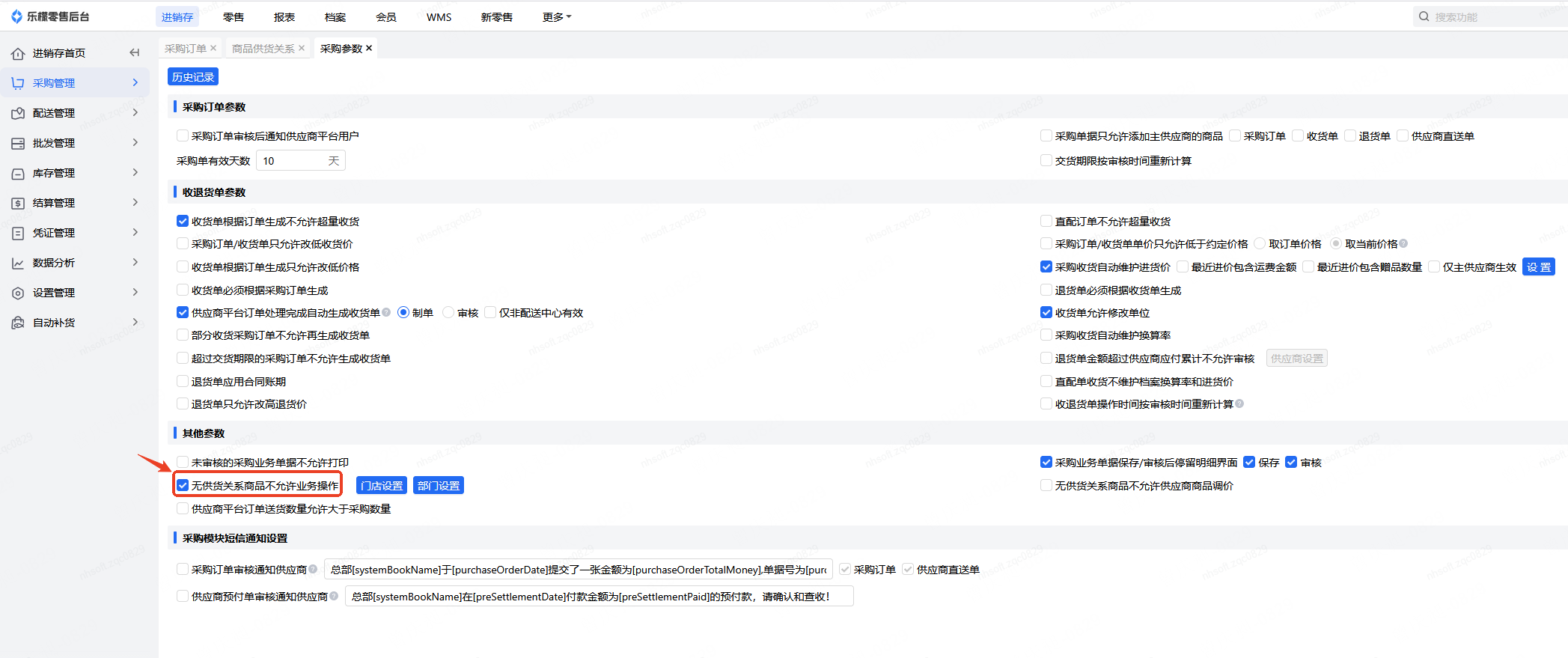 👉【操作路径】:进销存-采购管理-采购参数-无供货关系商品不允许业务操作