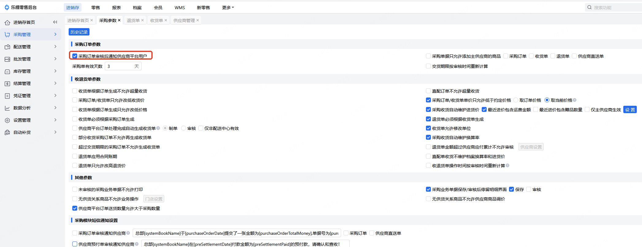👉【操作路径】:进销存-采购管理-采购参数-采购订单审核后通知供应商平台用户