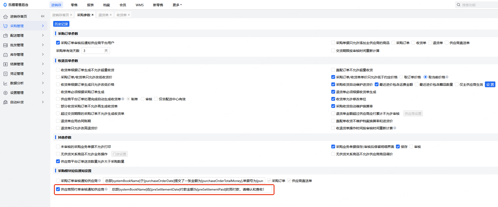 👉【操作路径】:进销存-采购管理-采购参数-供应商预付单审核通知供应商