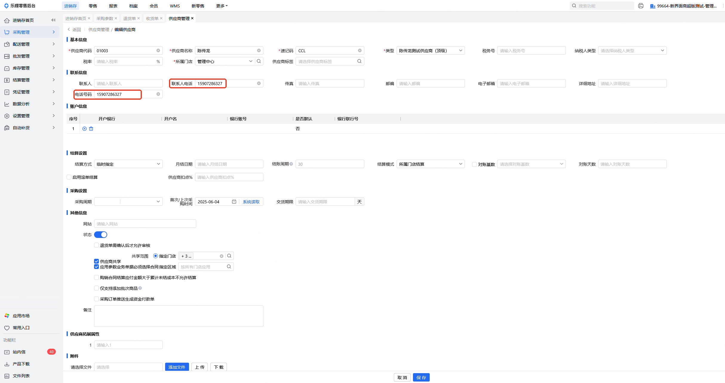 参数开启后,当预付单审核后会发送一个如下的短信给到供应商处,接受电话为供应商详情处设置中的号码