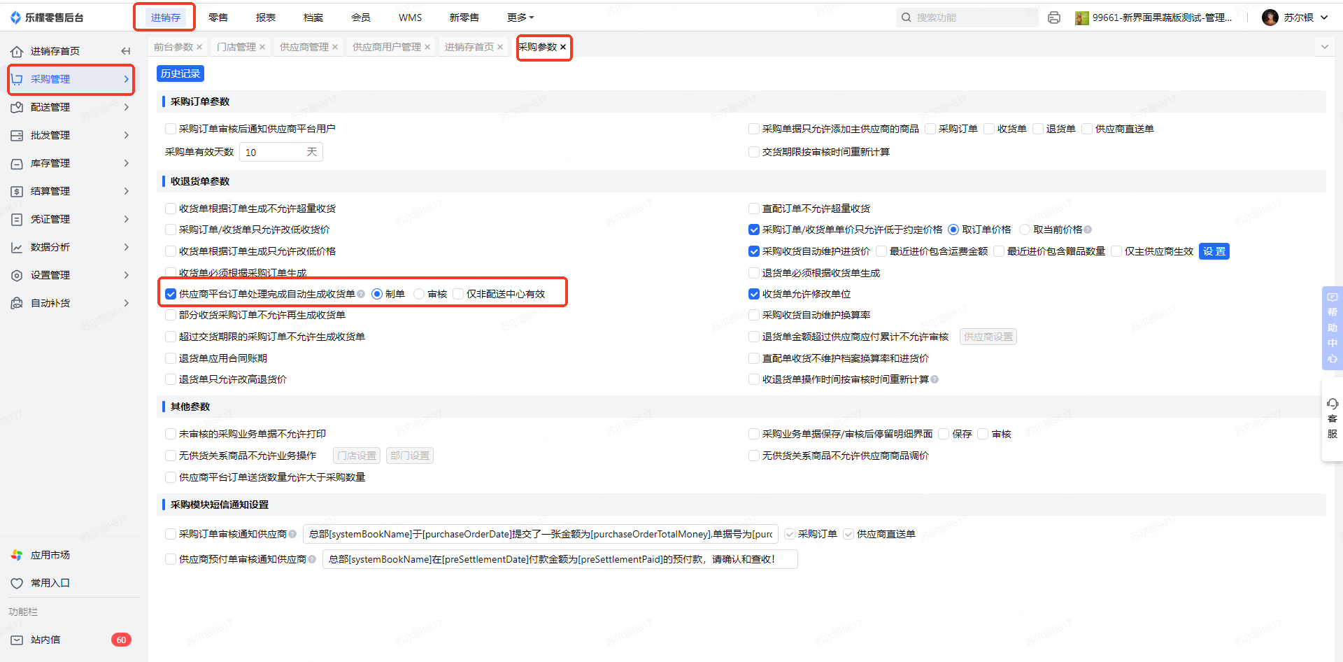👉【操作路径】:进销存-采购管理-采购参数-供应商平台订单处理完成自动生成收货单