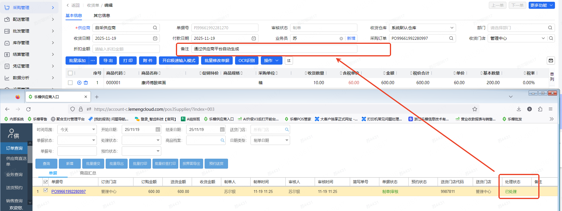 当乐檬零售的采购订单审核后,供应商平台同步也可以看到此订单,此时供应商可在供应商平台对此订单进行操作送货,需要设置供应商完成操作后自动在乐檬系统生成对应收货单