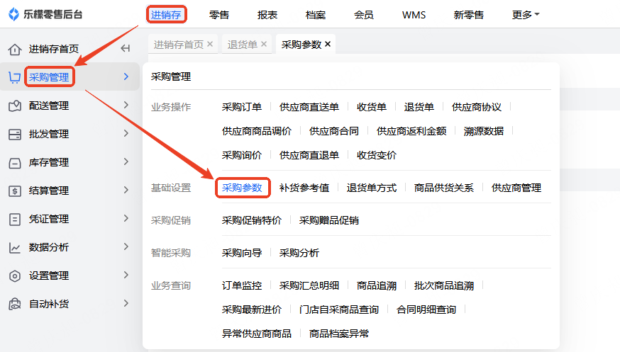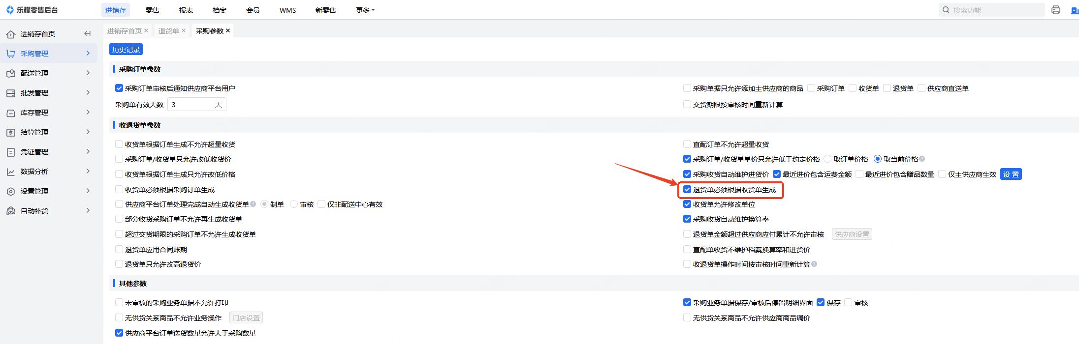 👉【操作路径】:进销存-采购管理-采购参数-退货单必须根据收货单生成