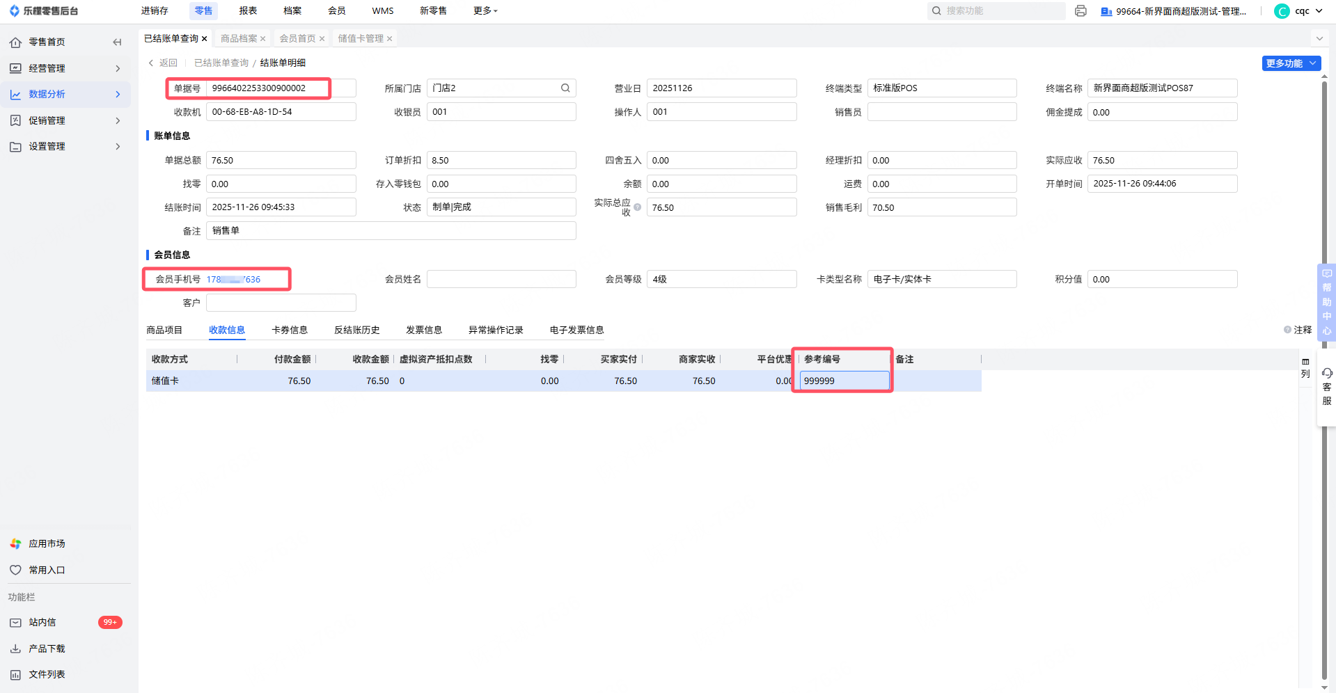 会员消费号与已结账单中会员手机号不一致