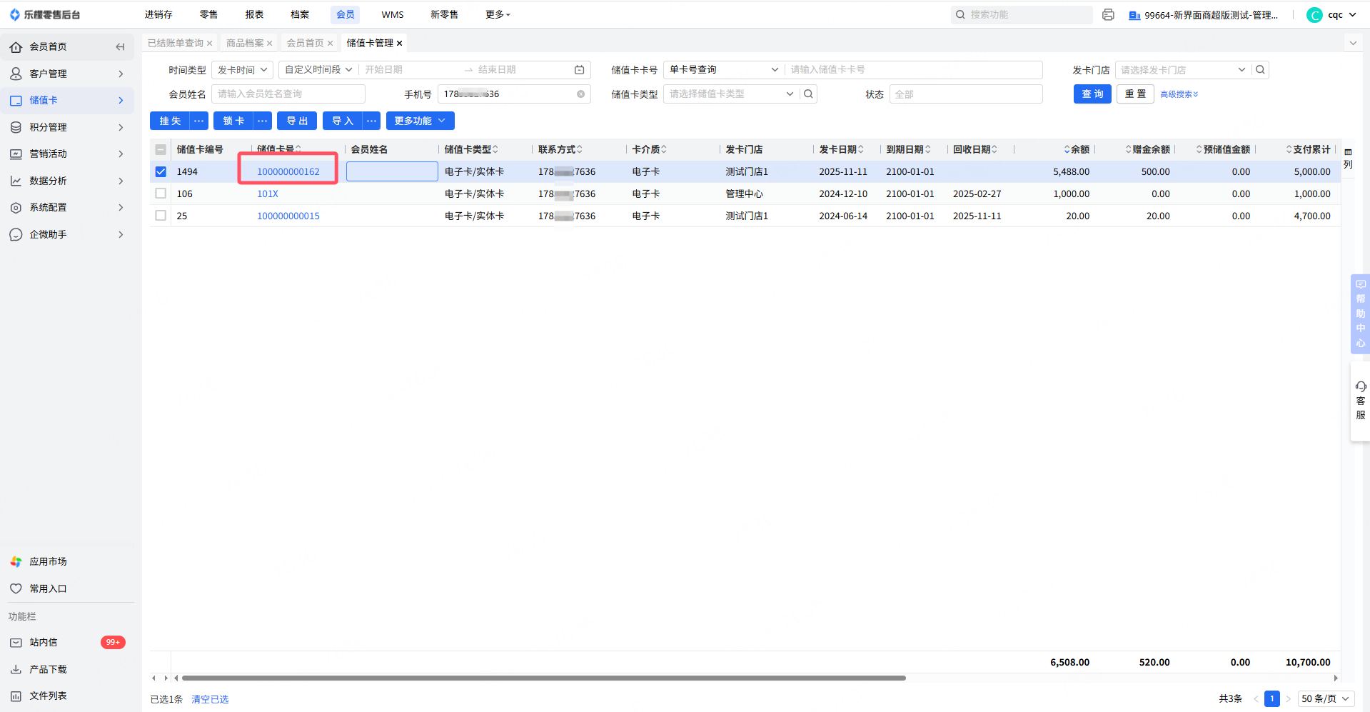 如下图案例,此订单扣款是从卡号999999扣的,会员录入的是别的手机号,所以会有不一致情况